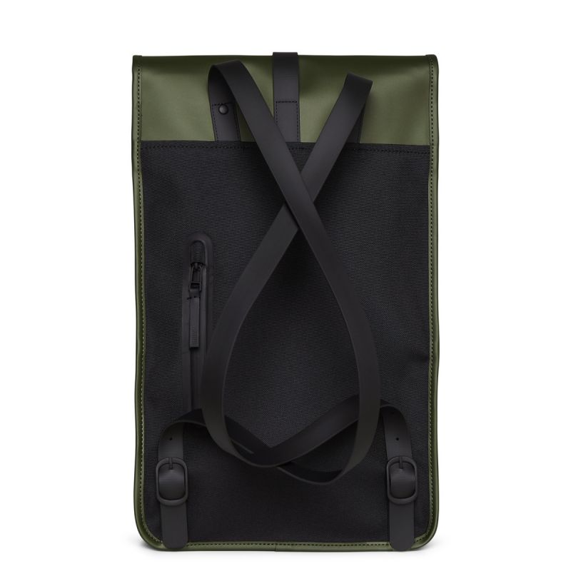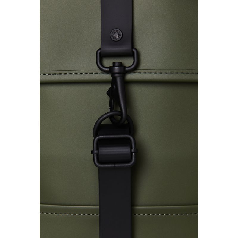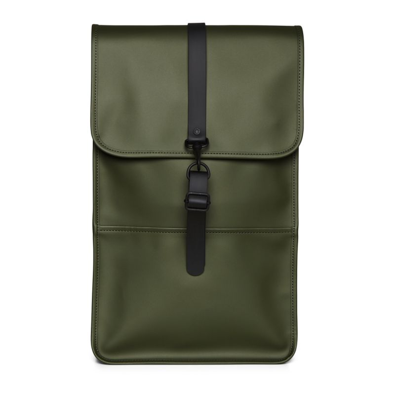 - Die Silhouette des Rucksacks ist ein klassisches Rains-Design mit einer hervorstehenden Klappe und einem zentralen Riemen mit Karabinerverschluss. Dieser schlichte und stets moderne wasserdichte Rucksack verfügt über ein internes Laptopfach, ein geräumiges Hauptfach und eine versteckte externe Handytasche auf der Rückseite.