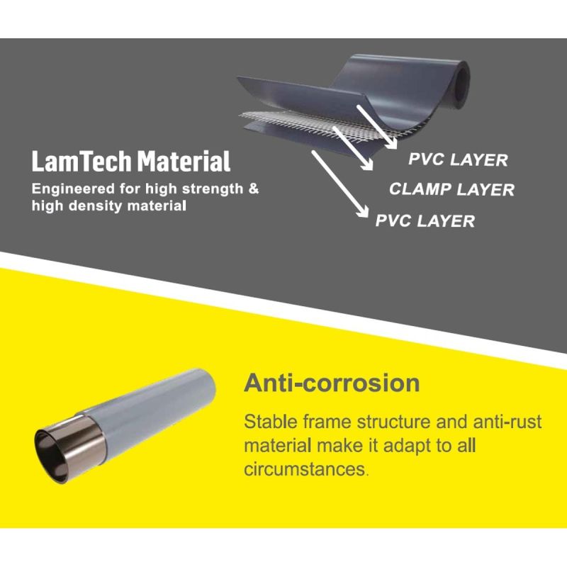 Der Pool verfügt über einen stabilen Stahlrahmen und -pfosten, die für hervorragende Stabilität und Widerstandsfähigkeit gegen Beschädigungen sorgen. Die Konstruktion ist so ausgelegt, dass sie intensiver Nutzung und wechselnden Witterungsbedingungen standhält und optimalen Schutz vor Verformung und Beschädigung bietet.