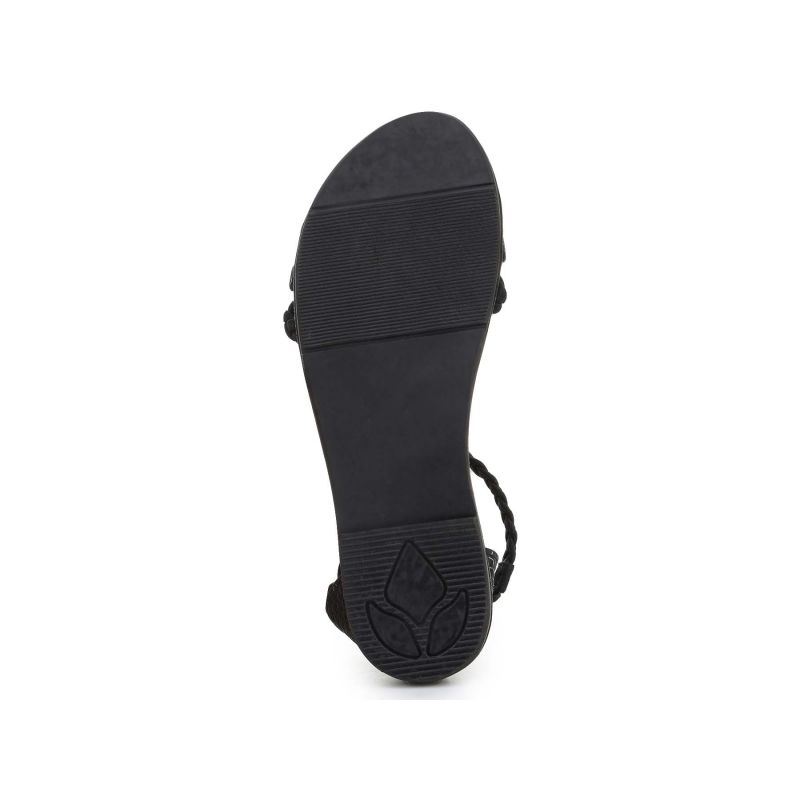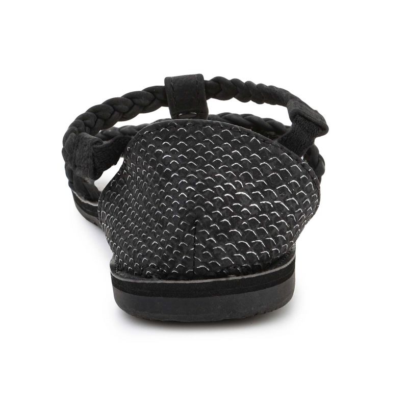 - Flache Sandalen mit weichen, gewebten Synthetikriemen vorne und um den Knöchel. Der Knöchelriemen ist außerdem elastisch für einfaches An- und Ausziehen.