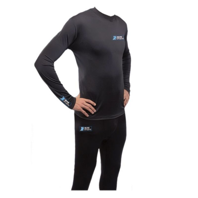 Die Produktpalette von Blue Sport umfasst Accessoires, Ergänzungen und Essentials für die Garderobe jedes Hockeyspielers. Farbe: Schwarz. Zweiteilige Ribano-Unterwäsche (Shirt + Hose). Material: Feuchtigkeitsableitendes Polyester und Elasthan. Kompressionskonstruktion. Flatlock-Nähte für mehr Komfort. Maschinenwaschbar.