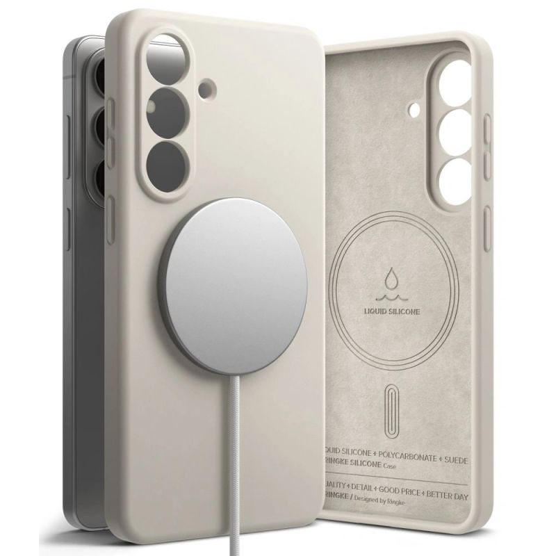Das Ringke Silicone MagSafe ist eine schlanke und robuste Hülle im Hybrid-Design. Ihre dreilagige Struktur kombiniert eine weiche Silikon-Außenhülle mit einem verstärkenden Polycarbonat-Rahmen im Inneren. Die weiche Mikrofaser-Oberfläche schützt die Rückseite des Smartphones vor Kratzern. Das Material passt sich perfekt der Form des Geräts an und ermöglicht vollen Zugriff auf alle Anschlüsse und Tasten. Die Silikonoberfläche fühlt sich angenehm an und sorgt für sicheren Halt, wodurch das Risiko eines Abrutschens im Alltag minimiert wird.