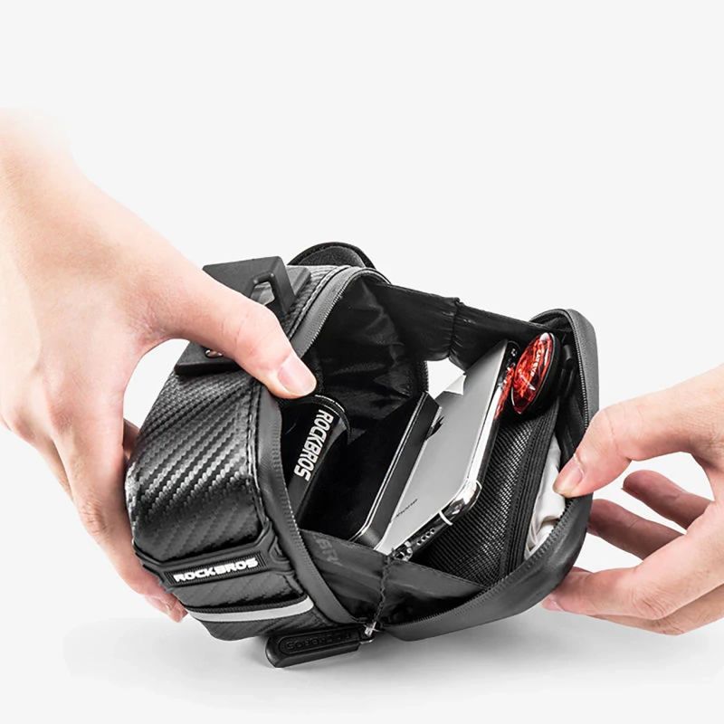 Die Rockbros B59 Fahrradtasche ist eine robuste Satteltasche mit einem Fassungsvermögen von ca. 1,5 Litern, die sich ideal zum Verstauen von wichtigen Utensilien während der Fahrt eignet. Ihre stabile Konstruktion mit Carbonfaser-Textur schützt den Inhalt und behält auch bei starker Beanspruchung ihre Form. Eine große seitliche Öffnung ermöglicht schnellen Zugriff auf die verstauten Gegenstände, während Innentaschen für Ordnung sorgen. Ein stabiles Befestigungssystem unter dem Sattel gewährleistet sicheren Halt, und ein reflektierendes Element sowie eine optionale Lichthalterung verbessern die Sichtbarkeit bei Dunkelheit.