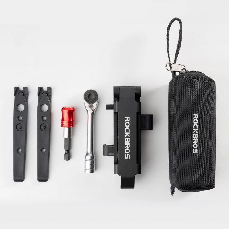Rockbros Multitool-Fahrradwerkzeugset mit Ratschenschlüssel und Reifenhebern – Schwarz