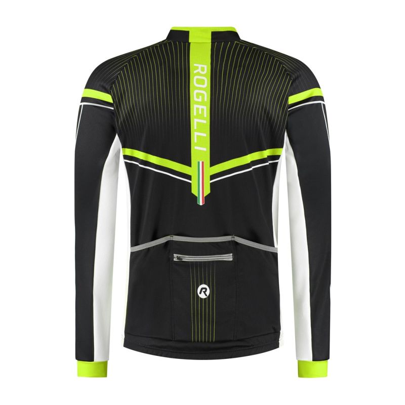 Das langärmlige Radtrikot GARA MOSTRO gehört neben anderen GARA MOSTRO Modellen zu den Topmodellen der Rogelli Kollektion. Das funktionelle GOLF+ Material aus 100 % Polyester mit Waffelstruktur und dezenter Innenisolierung sorgt für angenehmen Tragekomfort, auch an kühleren Tagen. Das Trikot lässt sich mit einem robusten Reißverschluss mit Metallzipper komplett öffnen. Der Saum ist mit einem elastischen Silikonband versehen. Ein auffälliger Print und mehrfarbige Einsätze unterstreichen die Attraktivität des Trikots. Im unteren Rückenbereich befindet sich eine dreigeteilte Tasche, ergänzt durch eine kleine Reißverschlusstasche. Sowohl die große Tasche als auch der Reißverschluss der kleinen Tasche sind mit reflektierenden Streifen versehen, um die Sichtbarkeit im Straßenverkehr zu verbessern. Die Ärmel sind mit einem breiten elastischen Saum abgeschlossen. Der dynamische, sportliche Look in Kombination mit dem hochwertigen Material macht dieses Trikot ideal für den häufigen Einsatz.