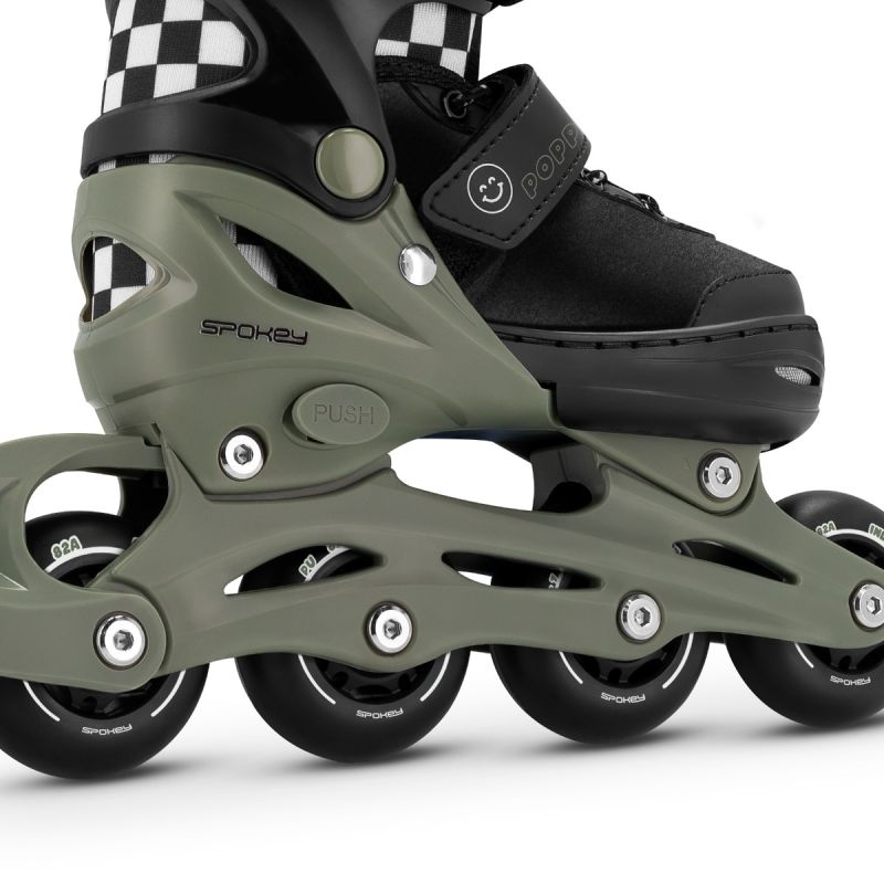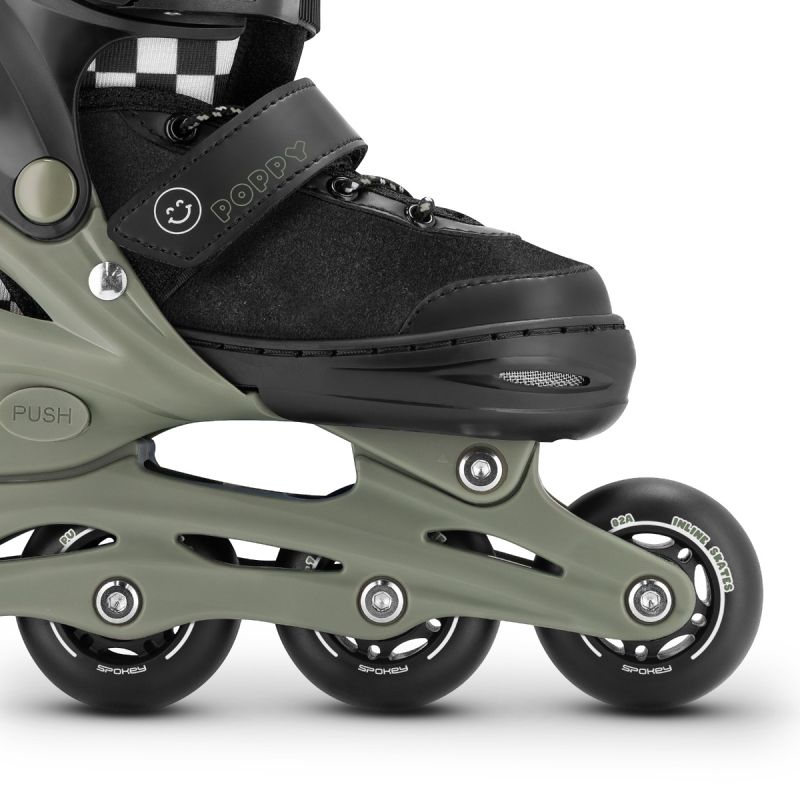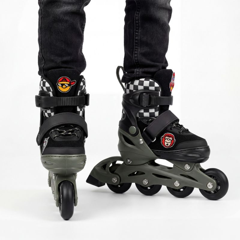 Verstellbare Inlineskates für Kinder. Der halbweiche Schuh sorgt für Komfort beim Skaten, und die verstellbare Größe ermöglicht es, die Skates an wachsende Füße anzupassen und so ihre Lebensdauer zu verlängern. Die Rollen mit einer Härte von 82A bieten optimale Traktion und Vibrationsdämpfung auf Asphalt. ABEC-7-Kugellager gewährleisten ein sanftes und leises Fahrgefühl. Ein dreifaches Verschlusssystem (Schnalle, Klettverschluss, Schnürsenkel) stabilisiert den Fuß und verhindert ein Verrutschen beim Skaten. Im Set enthalten sind austauschbare Klett-Applikationen zur individuellen Gestaltung der Skates. Parameter: Schuh: halbweich, verstellbar; Schuhmaterial: Polyester, PP; Rahmenmaterial: PP; Rollenmaterial: PU; Rollenhärte: 82A; Rollendurchmesser: 64 mm; Kugellager: ABEC-7; Verschlüsse: zweiteilige Schnalle, Klettverschluss, Schnürsenkel; Größen: 27–30 oder 31–34; Bremse: TPR; Lieferumfang: 8 Klett-Applikationen zur individuellen Gestaltung. Benutzergewicht: 60 kg. Empfohlen für: Freizeitfahrten. Erfahrungsstufe: Anfänger. Sicherheitshinweise: Persönliche Schutzausrüstung muss getragen werden. Nicht geeignet für Kinder über 60 kg. Benutzung nur unter Aufsicht von Erwachsenen. Nicht im Straßenverkehr benutzen. Nicht für gewerbliche Zwecke.