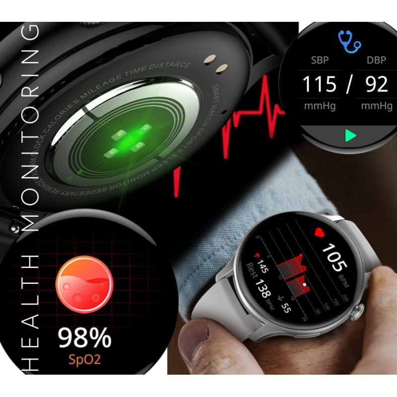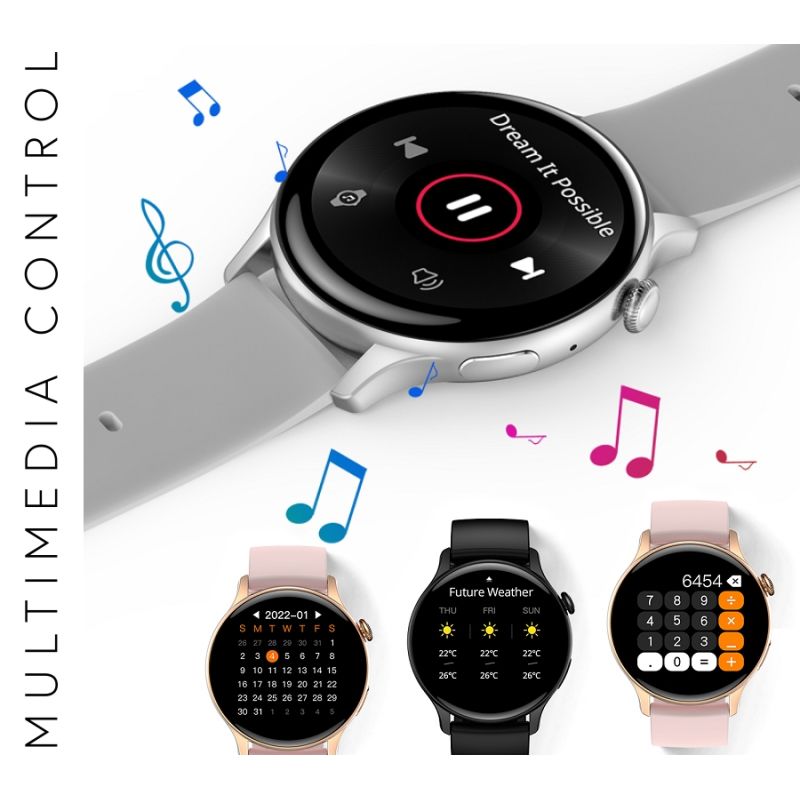 Funktionen? Genau da, wo du sie brauchst – von über 10 Sportmodi, Atemtraining, Herzfrequenzmesser, Pulsoximeter und Blutdruckmessgerät bis hin zu Schrittzähler, Kalorienzähler, Schlafüberwachung und Zyklus-Tracker. Die Smartwatch erinnert dich an Bewegung, zeigt das Wetter an, hat Wecker, Timer, Taschenrechner und Kalender und benachrichtigt dich über Anrufe und Nachrichten von Facebook, WhatsApp, SMS und vielen anderen Apps.