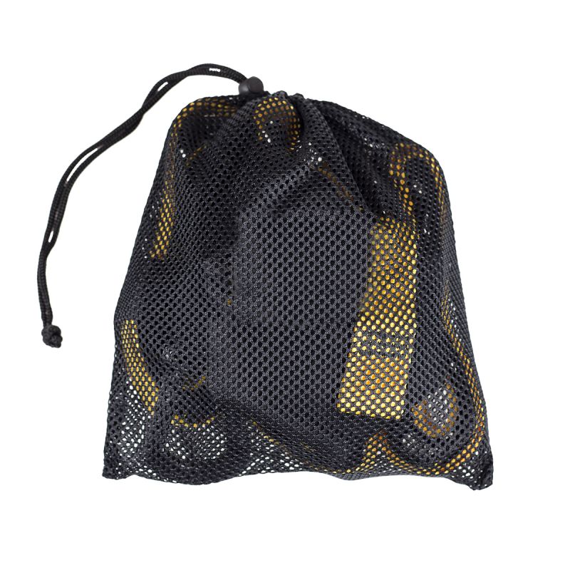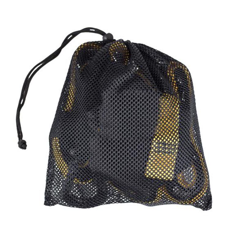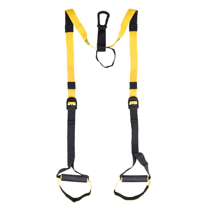 Das Set beinhaltet Trainingsbänder mit Griffen und Metallkarabiner, einen Türhalter und ein Netz. Die Griffe sind mit Schaumstoff überzogen, um ein Verrutschen während des Trainings zu verhindern.