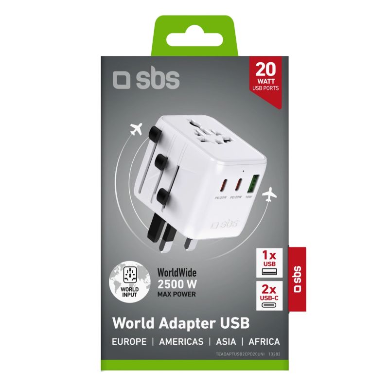 Der SBS 2xUSB-C 1xUSB-A Universal-Reiseadapter ist ein vielseitiger Reiseadapter, mit dem Sie bis zu 5 Geräte gleichzeitig aufladen können. Mit zwei 20-W-USB-C Power Delivery Anschlüssen und einem 18-W-USB-A- Anschluss eignet er sich perfekt zum Laden von Smartphones, Tablets, kabellosen Kopfhörern und Powerbanks – ob im Hotel, Büro, Flughafen oder unterwegs. Dank seines kompakten Designs und des Push & Slide -Systems lässt er sich schnell an Steckdosen in über 150 Ländern anpassen. Der ideale Reisebegleiter.