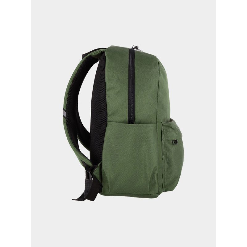 Der Rucksack besteht aus einem synthetischen Material mit glatter Oberfläche , das strapazierfähig und pflegeleicht ist. Die Außenschicht ist mit einer wasserabweisenden Imprägnierung versehen, die die Feuchtigkeitsaufnahme verlangsamt – Wasser perlt an der Materialoberfläche ab und rinnt einfach ab, wodurch der Inhalt des Rucksacks vor Regen geschützt ist.