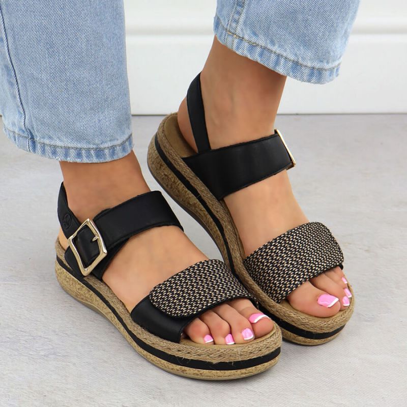 Schwarze Keilsandalen aus Leder für Damen mit Klettverschluss, Rieker V0951