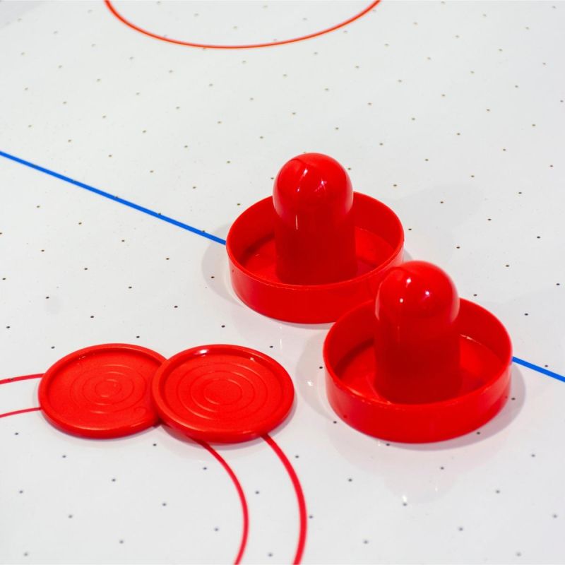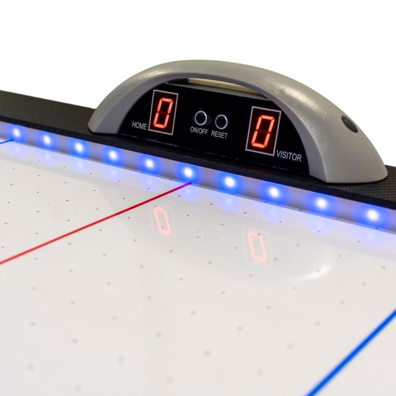Der Tisch verfügt über einen speziellen Ventilator, der an eine Stromversorgung angeschlossen ist und Luft durch eine perforierte Oberfläche bläst, wodurch der Puck leicht angehoben wird. Dies erzeugt einen spielähnlichen Effekt, ähnlich dem Gleiten des Pucks über eine Eisfläche.