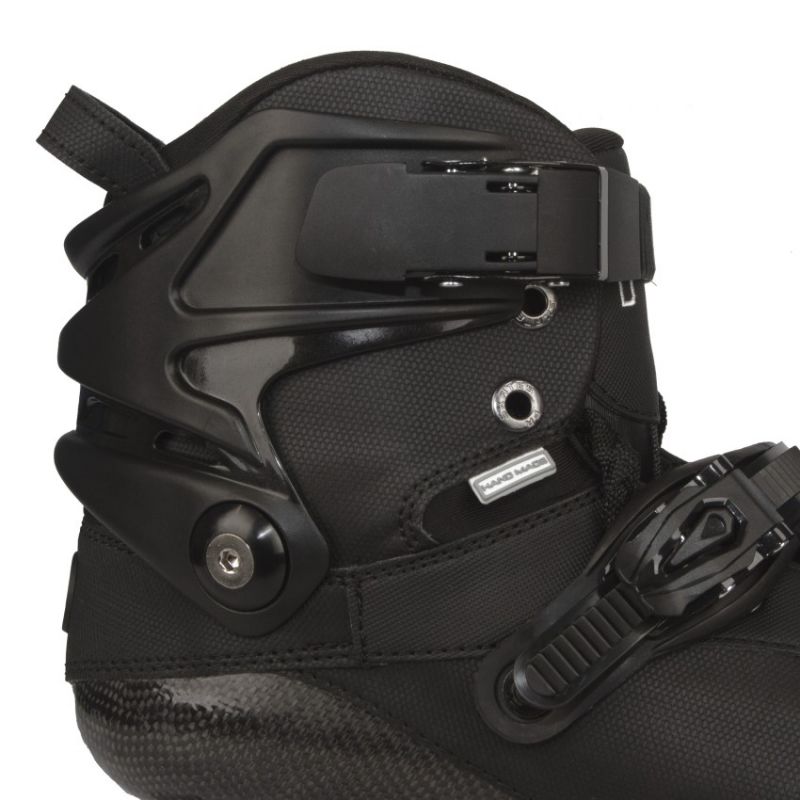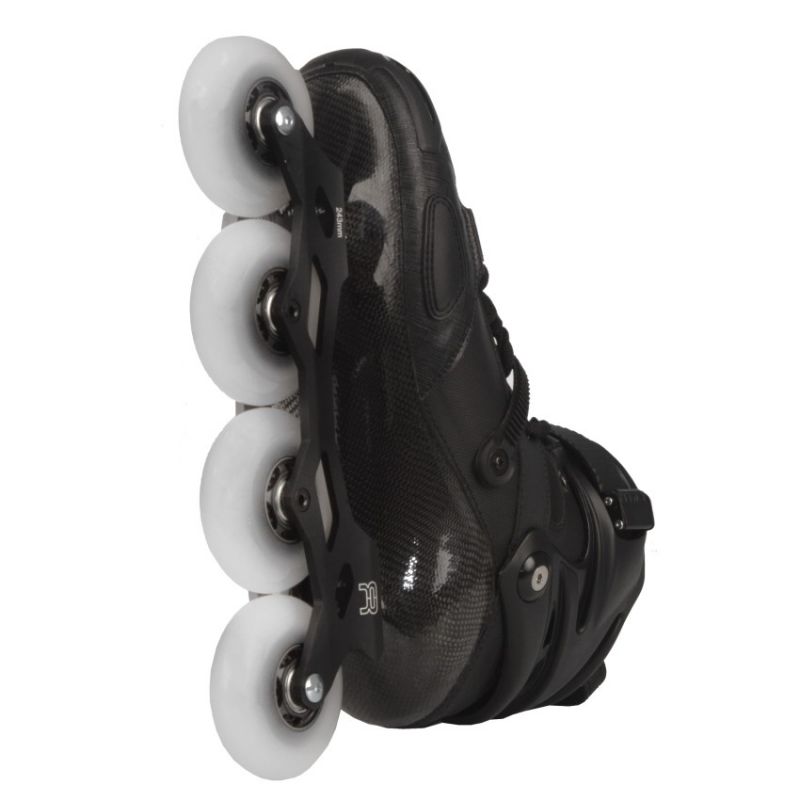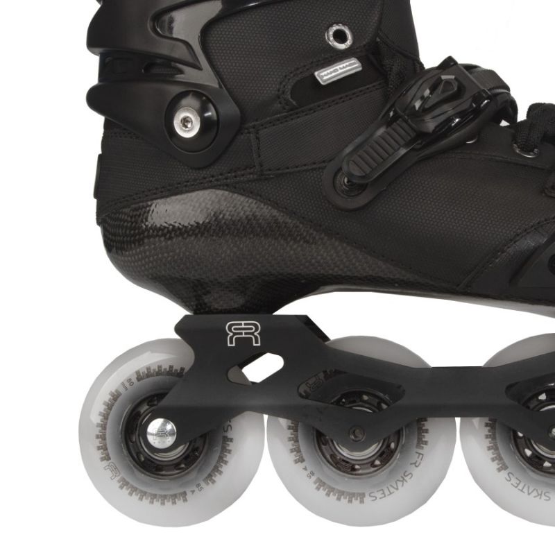 - Schuh: Die Schale besteht aus Carbon- und Glasfasern. Sie ist so gefertigt, dass sie sich perfekt an die Anatomie des Trägers anpasst und den Fuß festhält. Bei korrekter Schnürung und Befestigung bieten diese Skates ein Maß an Kontrolle und Bewegungspräzision, das mit teureren Modellen mithalten kann. Unter dem Fuß stützt eine Einlegesohle das Fußgewölbe, was das Skaten komfortabler macht und die Antriebsenergie effizienter auf die Rollen überträgt. Der Schuh ist mit strapazierfähigem Material gefüttert, und die am stärksten beanspruchten Bereiche, d. h. die Seiten (Außenseite) und die Zehen, sind zusätzlich mit abriebfesten Kunststoffüberzügen geschützt.