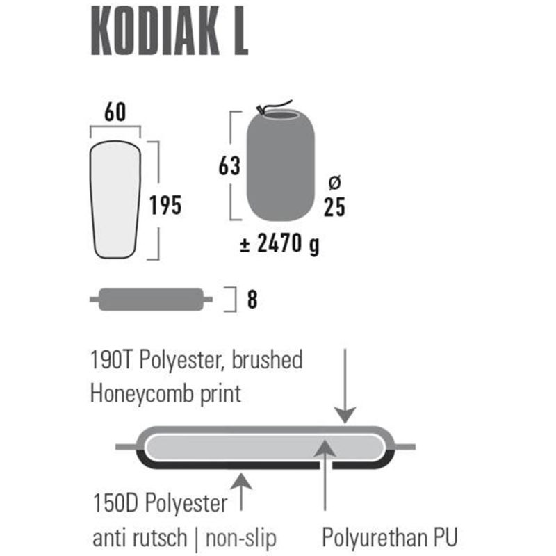 Diese selbstaufblasende Isomatte mit hochdichtem Schaumstoff bietet optimale Isolierung und Komfort. Die „Wave Cut“-Oberfläche passt sich optimal dem Körper an. Die selbstaufblasende Matte besteht aus hochwertigem, rutschfestem, gebürstetem Polyestergewebe. Die Unterseite besteht aus strapazierfähigem, rutschfestem Polyester. Die selbstaufblasende Kodiak-Matte ist mit einem Rückschlagventil ausgestattet. Die Matte wird mit zwei Kompressionsgurten und einem Packsack geliefert.