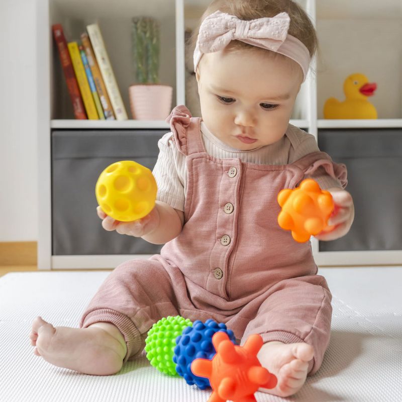 - Ein Satz Bälle mit unterschiedlichen Texturen und Formen, die sich zum Werfen, Rollen, Drücken und Beißen während des Zahnens eignen.