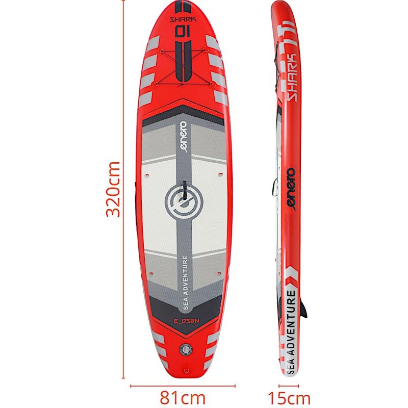 In den Warenkorb legen, aufpumpen und los geht's auf dem Wasser – SET – 150 kg aufblasbares SUP-Board ENERO 320 x 81 x 15 cm SHARK steht für grenzenloses Vergnügen.