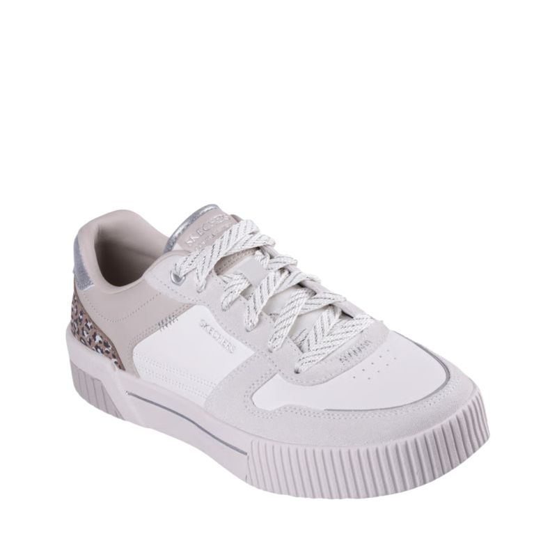 Skechers Jade Lustrouse Luxury Damenschuhe Weiß 185390 WMLT. Diese flachen Damenschuhe von Skechers vereinen Komfort und Stil für jeden Tag. Das Obermaterial aus Synthetikleder und Veloursleder sorgt für bequemen Tragekomfort und Langlebigkeit. Das Skechers Air-Cooled Memory Foam Fußbett dämpft jeden Schritt und bietet zusätzlichen Komfort, während die Gummisohle für Halt und Flexibilität sorgt. Das Modell hat einen 3,2 cm hohen Absatz und besticht durch Details im Leopardenmuster sowie einen metallischen Absatzabschluss.