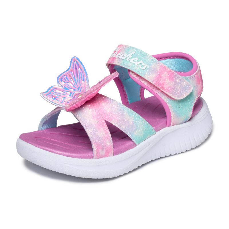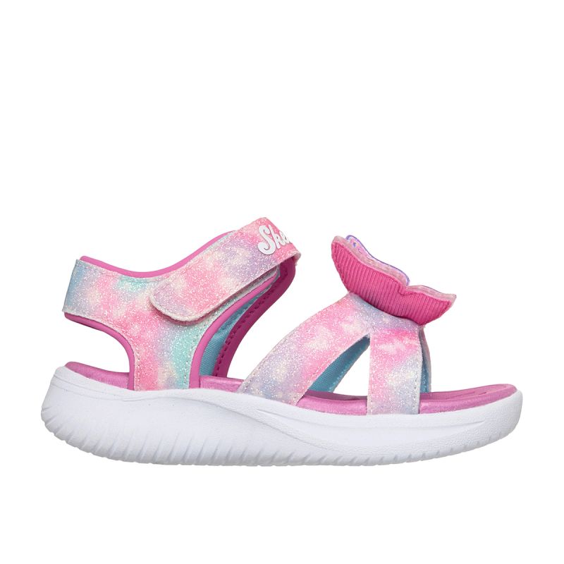 Mit den Skechers Jumpsters - Butterfly Brights Sandalen bringen Sie Ihre Kinder zum Strahlen. Das leuchtende Schmetterlingsdesign besticht durch ein schimmerndes Obermaterial aus Synthetik, einen verstellbaren Skechers-Verschluss und ein gepolstertes, bequemes Fußbett.