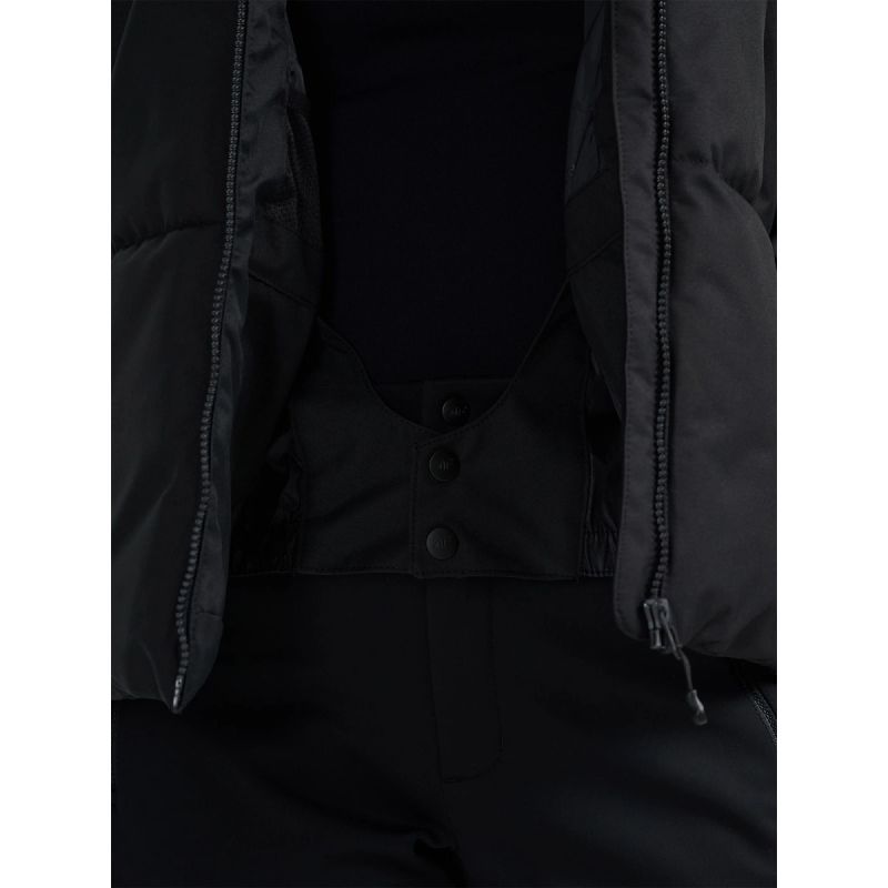 Die Jacke hat eine Kapuze mit verstellbarem Rückenteil , die eng anliegt und vor Wind schützt. Sie verfügt über drei Außentaschen mit Reißverschluss (zwei Seitentaschen und eine Skipasstasche) sowie zwei Innentaschen , darunter eine mit Reißverschluss – ideal für Skibrille und kleinere Accessoires.