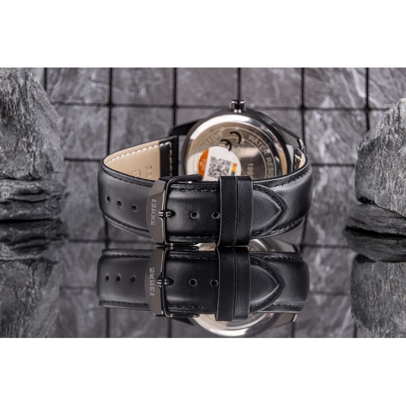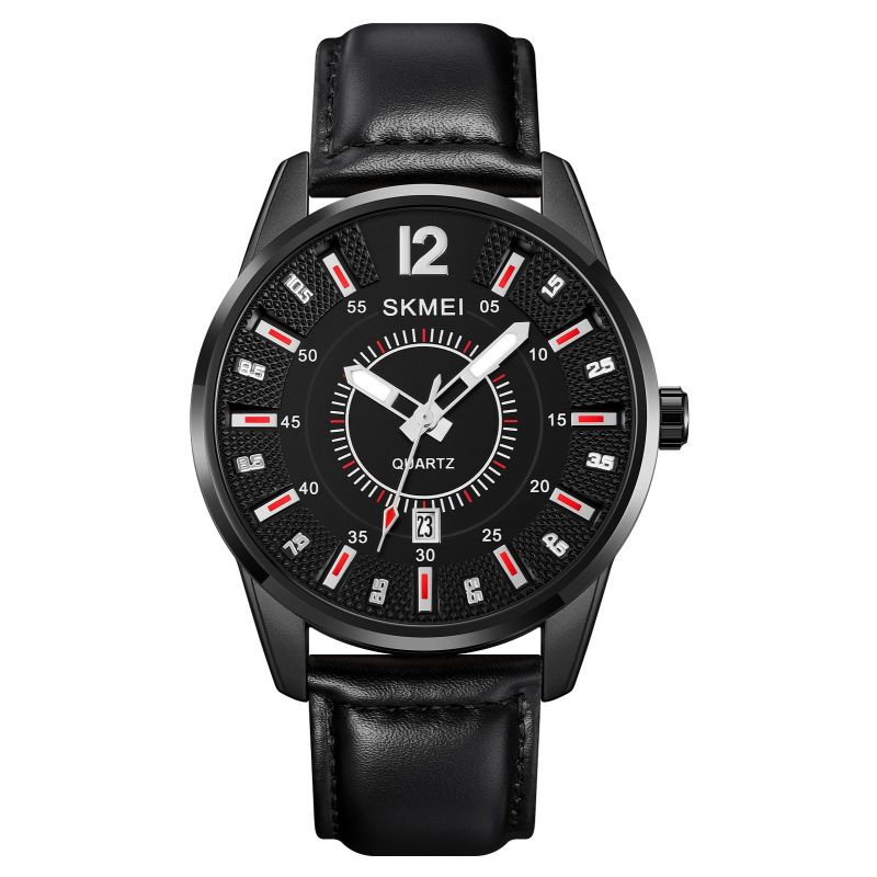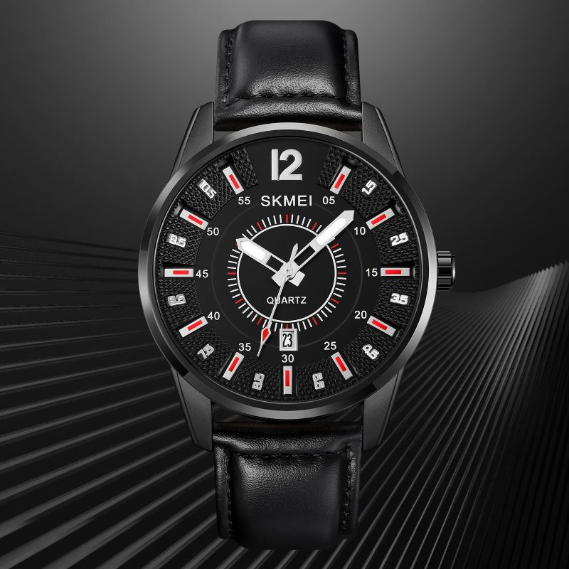 Das Zifferblatt der Skmei 1993BK ist durchdacht gestaltet und detailreich. Es vereint Stil und Dynamik und ist perfekt für den Mann, der Eleganz und Funktionalität gleichermaßen schätzt. Rote Akzente an den Indizes und um den zentralen Ring setzen einen markanten und sportlichen Akzent. Dieser Kontrast ist ein echter Hingucker und sorgt dafür, dass jedes Element des Zifferblatts sofort ins Auge fällt.