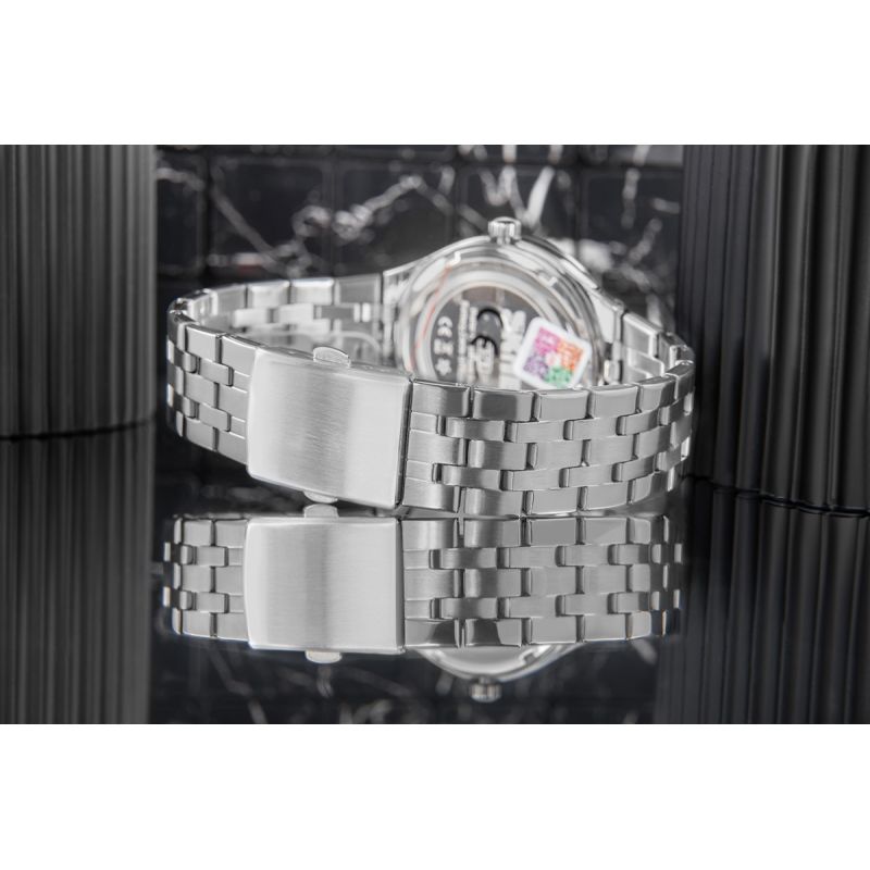 Sie haben sie sicher schon bemerkt: Die grünen Punkte auf dem Zifferblatt setzen einen dezenten, aber dennoch markanten Akzent und unterstreichen den modernen Charakter dieses Modells. Scharfe Indizes und präzise gestaltete Zeiger verleihen dem Zifferblatt einen dynamischen und maskulinen Look und gewährleisten gleichzeitig hervorragende Ablesbarkeit. Die markante römische Ziffer bei 12 Uhr verleiht der Uhr einen Hauch von Klasse und hebt sie von anderen ab. Dieses Modell verfügt über fluoreszierende Zeiger, die ein schnelles Ablesen auch bei schlechten Lichtverhältnissen ermöglichen. Das elegante Armband, das matte und glänzende Elemente kombiniert, rundet das Design perfekt ab.