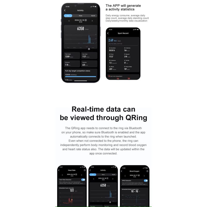 Die Daten in Echtzeit sind über die QRing-App verfügbar. Selbst wenn der Ring aktuell nicht mit Ihrem Smartphone verbunden ist, kann er Ihren Körper unabhängig überwachen und Blutsauerstoffsättigung sowie Herzfrequenz aufzeichnen. Die Daten werden beim nächsten Verbinden mit der App synchronisiert.