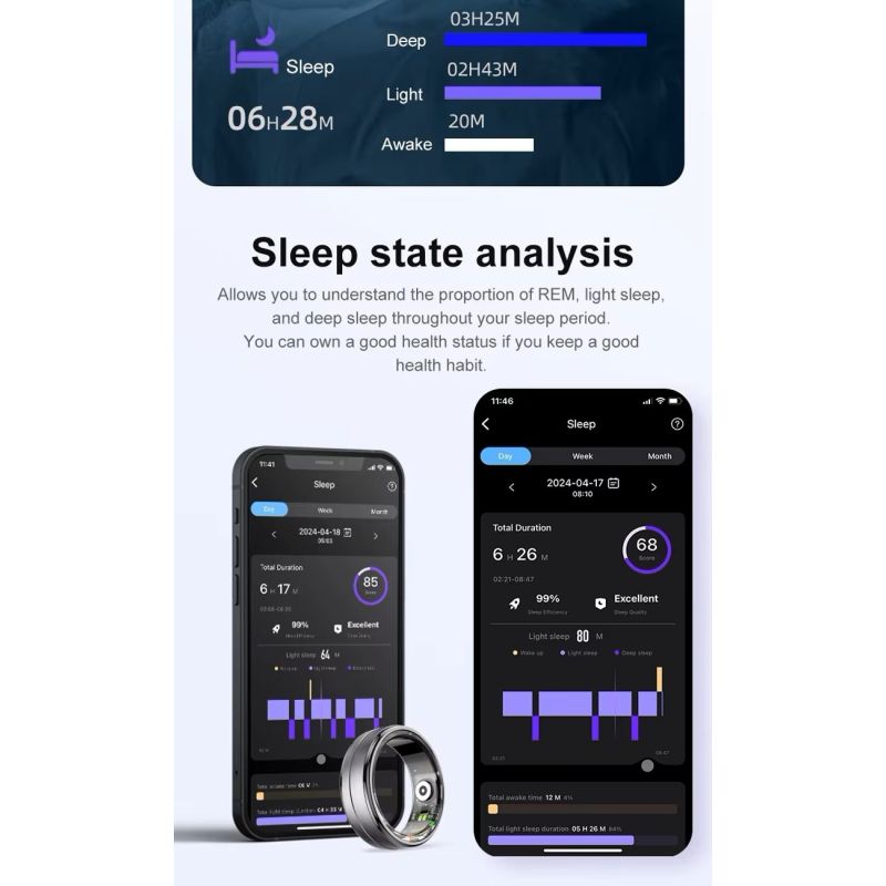 Dank fortschrittlicher Biosensoren erfasst der Blaupunkt Ring präzise Ihre nächtlichen Zyklen und analysiert Ihre Bewegungen, Schlafphasen und deren Qualität. Jeden Morgen erhalten Sie einen detaillierten Bericht – wie tief Sie geschlafen haben, wann Ihr Gehirn im REM-Schlaf geträumt und wann es sich im leichten Schlaf befand. Der Blaupunkt Ring misst nicht nur, er lernt von Ihnen und hilft Ihnen so, bessere und gesündere Gewohnheiten zu entwickeln.