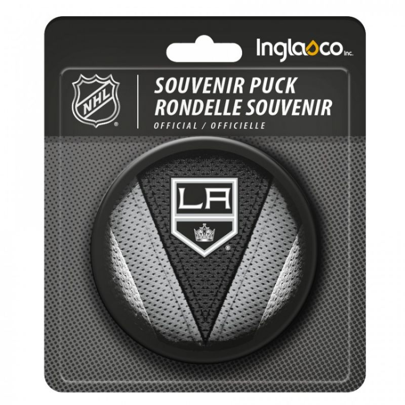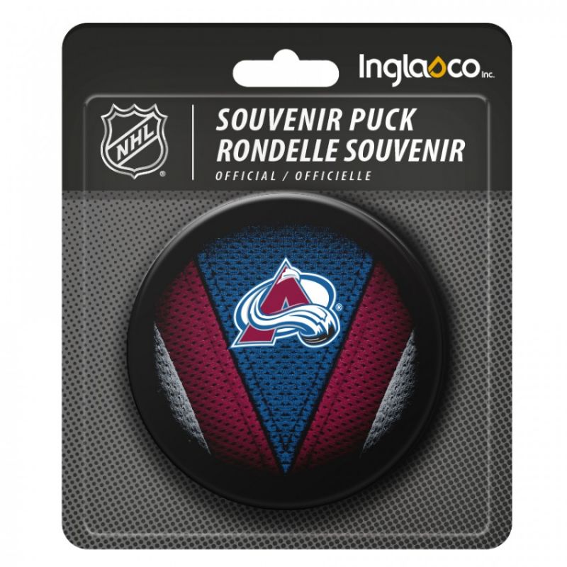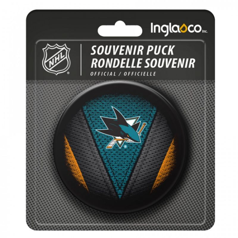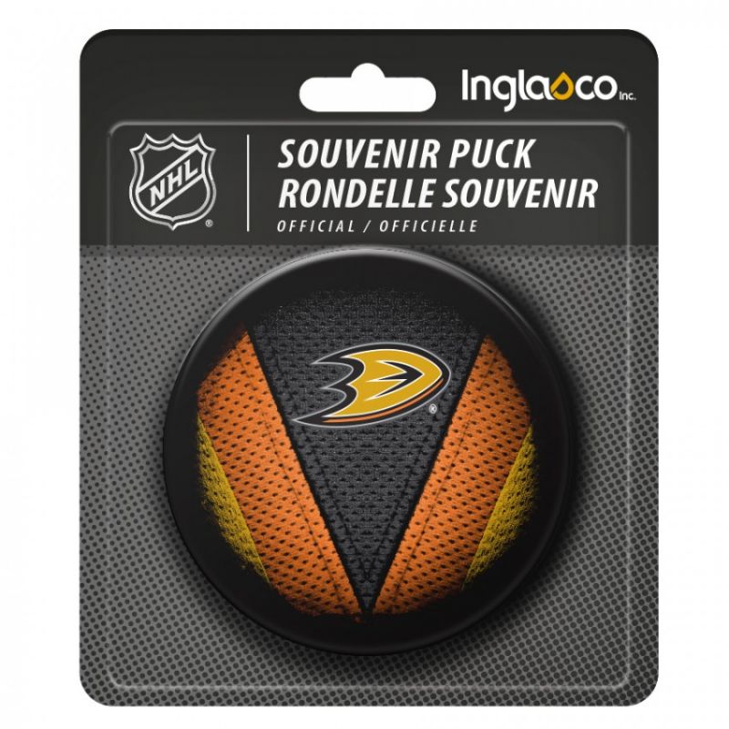 Inglasco NHL Stitch Souvenir-Hockeypuck. Dieser Souvenirpuck ist ein offizieller 6 Unzen (170 Gramm) schwerer slowakischer Puck mit einem detaillierten Teamlogo auf der einen und dem NHL-Logo auf der anderen Seite. Ungefähr 3 Zoll im Durchmesser.