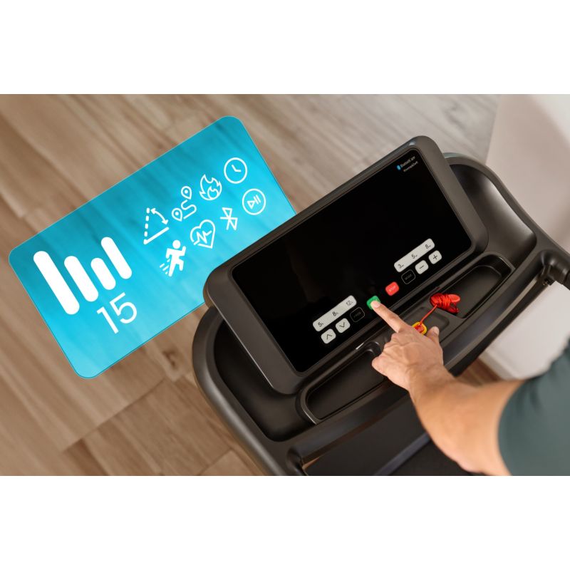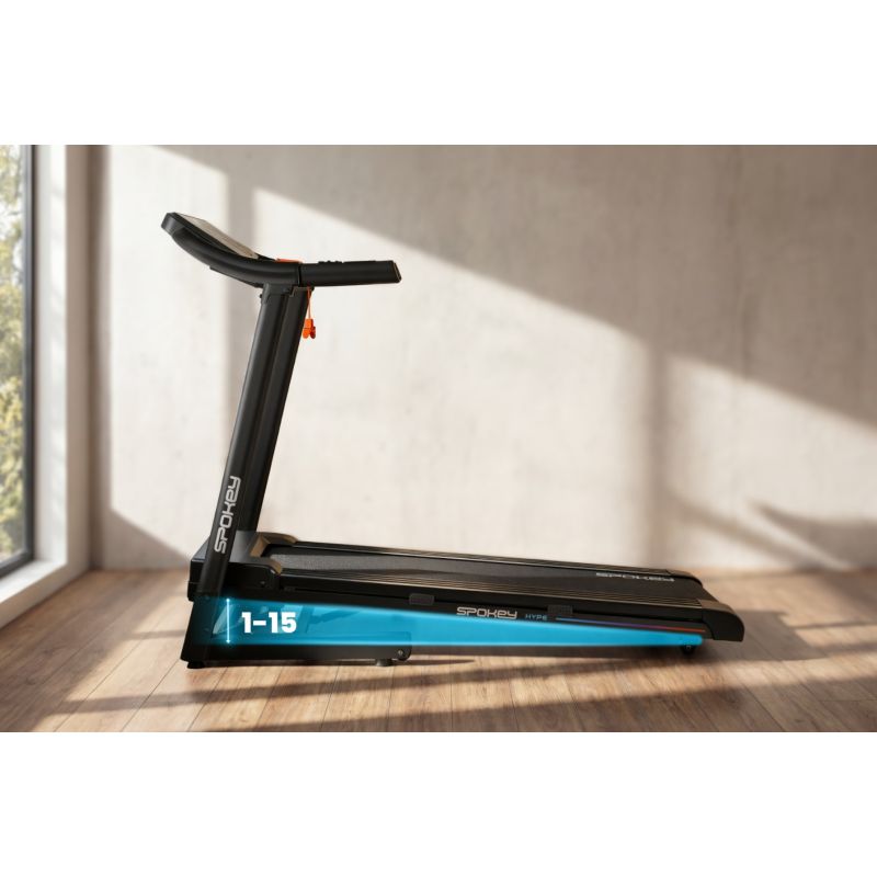 Spokey HYPE faltbares elektrisches Laufband mit automatischer Neigungsverstellung (1-15 %), 15 Trainingsprogrammen und anpassbarem Training für bis zu drei Benutzer. Ausgestattet mit einem großen LED-Bildschirm, Stoßdämpfung, Herzfrequenzsensoren und praktischen Tablet- und Wasserflaschenhaltern ist es perfekt für das tägliche Training zu Hause. Einführung: Spokey HYPE ist ein Heimlaufband, das Benutzerfreundlichkeit mit einer Vielzahl von Trainingsmöglichkeiten kombiniert. Mit automatischer Neigungsverstellung, 15 Programmen und der Möglichkeit, Trainingspläne für bis zu drei Benutzer zu personalisieren, können Sie Ihr Training an Ihre individuellen Bedürfnisse anpassen. Dank seines faltbaren Designs, der Stoßdämpfung und der praktischen Tablet- und Wasserflaschenhalter wird das Laufen zu Hause mit dem HYPE-Laufband wirklich komfortabel und motivierend. Warum lohnt es sich, das Spokey HYPE-Laufband auszuprobieren? 15 Trainingsprogramme: Ein umfassender Satz von 15 vorprogrammierten Trainingsprogrammen ermöglicht es Ihnen, Ihr Training abwechslungsreicher zu gestalten und die Intensität an Ihre Fähigkeiten anzupassen. Jedes Programm ist in 20 Abschnitte unterteilt, wobei Geschwindigkeit und Steigung automatisch angepasst werden – eine großartige Möglichkeit, unterschiedliche Bedingungen zu simulieren und Monotonie beim Laufen zu vermeiden. 3 personalisierte Programme: Das Laufband ermöglicht es Ihnen, eigene Trainingspläne für drei verschiedene Benutzer zu erstellen und zu speichern. So kann jeder in Ihrem Haushalt schnell seinen Modus wählen und individuell trainieren, ohne Parameter neu einstellen zu müssen. Tablet- und Flaschenhalter: Während Ihres Trainings haben Sie alles, was Sie brauchen, immer griffbereit – Ihr Lieblingsgetränk in Reichweite und ein Tablet oder Smartphone, auf dem Sie Filme schauen, Musik hören oder Trainings-Apps nutzen können. Das vereint Komfort und Motivation. Dämpfung: Das Dämpfungssystem absorbiert effektiv Stöße beim Laufen, reduziert die Belastung der Gelenke und sorgt für mehr Komfort. So wird jedes Training angenehmer und effektiver für den Körper, auch bei längeren Einheiten. Detaillierte Beschreibung: Das elektrische Laufband Spokey HYPE ermöglicht Ihnen ein effektives Training, ohne das Haus verlassen zu müssen. Der leistungsstarke 1,75-PS-Motor ermöglicht Geschwindigkeiten von bis zu 14 km/h – perfekt für zügiges Gehen und intensives Laufen. Das breite Laufband (122 x 40 cm) ermöglicht volle Bewegungsfreiheit und das Dämpfungssystem macht jeden Schritt komfortabel und geschmeidig. Trainieren Sie, wann immer Sie wollen und ganz nach Ihren Wünschen! Mit 15 Trainingsprogrammen können Sie die Intensität Ihres Trainings ganz einfach anpassen und die individuelle Anpassung für bis zu drei Personen bedeutet, dass jeder das Laufband bequem nutzen kann. Der große LED-Bildschirm zeigt wichtige Daten in Echtzeit an und in die Handläufe integrierte Herzfrequenzsensoren ermöglichen die Überwachung Ihrer Herzfrequenz. Das HYPE-Laufband ist platzsparend konzipiert – es lässt sich zusammenklappen und vertikal verstauen, und Transportrollen erleichtern den Transport. Praktische Details wie ein Tablet- und ein Flaschenhalter erhöhen den Komfort, während ein Sicherheitsschlüssel für zusätzlichen Schutz während des Trainings sorgt. Technische Daten Typ: elektrisches Laufband Motorleistung: 1,75 PS Maximale Geschwindigkeit: 14 km/h Steigung: automatisch: 1–15 % Display: LED Anzeigefunktionen: Zeit, Distanz, Geschwindigkeit, Puls, Kalorien Trainingsprogramme: 15 + 3 personalisiert Pulsmessung: ja Laufband: 122 × 40 cm Abmessungen: 143 × 67 × 111 cm Abmessungen nach dem Zusammenklappen: 64 × 67 × 135 cm Gerätegewicht: 47 kg Maximales Benutzergewicht: 110 kg Zusammenklappen: hydraulisch Tablet- und Flaschenhalter: ja Transportrollen: ja Bluetooth: ja Zertifikate, Normen und Warnhinweise Entspricht den EU-Sicherheitsnormen. Das Produkt ist nur für den Heimgebrauch bestimmt. Das Gerät ist nicht für Kinder bestimmt. Gebrauch und Pflege Vor dem ersten Gebrauch sicherstellen, dass das Laufband auf einem stabilen und ebenen Untergrund steht. Es wird empfohlen, das Gerät auf eine stoßdämpfende Matte zu stellen, um Lärm und Vibrationen zu reduzieren. Nach jedem Training das Gerät mit der Taste ausschalten und anschließend den Netzstecker ziehen. Reinigen Sie das Laufband und das Gehäuse regelmäßig mit einem weichen, feuchten Tuch. Vermeiden Sie die Verwendung aggressiver Reinigungsmittel. Lagern Sie das Gerät nicht in feuchten oder sehr sonnigen Räumen. Das Laufband ist nur für den Heimgebrauch bestimmt – verwenden Sie es nicht in gewerblichen Umgebungen und machen Sie es nicht für Kinder zugänglich. Häufig gestellte Fragen: Ist das Spokey HYPE Laufband für intensives Training geeignet? Ja, dank des 1,75 PS starken Motors und Geschwindigkeiten von bis zu 14 km/h ist das HYPE sowohl für Geh- als auch für normales Lauftraining geeignet. Kann das Spokey HYPE Laufband zusammengeklappt werden? Ja, dank des hydraulischen Systems kann es zusammengeklappt und vertikal gelagert werden. Transportrollen erleichtern den Transport. Verfügt das Laufband über eine Stoßdämpfung? Ja, vier Stoßdämpfungspunkte reduzieren die Belastung der Gelenke und verbessern so den Laufkomfort.