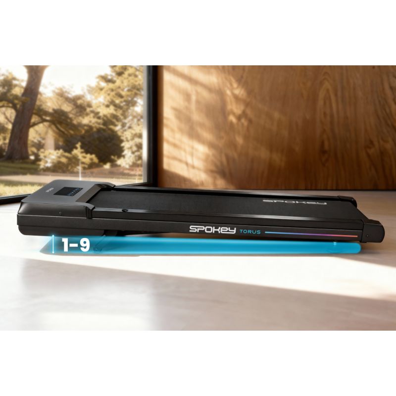 Spokey TORUS Elektronisches Laufband mit Walking-Pad. Ein kompaktes elektrisches Laufband mit automatischer Steigungsverstellung und komfortabler Fernbedienung. Dank seiner geringen Größe und des flachen Designs ist es ideal für das Training zu Hause, auch auf kleinem Raum. Einführung: Suchen Sie ein kompaktes Laufband, das auch in eine kleine Wohnung passt und gleichzeitig ein abwechslungsreiches und komfortables Training ermöglicht? Das Spokey TORUS ist ein modernes Laufband mit Walking-Pad, ideal für tägliches Gehen und leichte Übungen in den eigenen vier Wänden. Automatische Steigungsverstellung, intuitive Fernbedienung und eine Wartungserinnerungsfunktion machen Ihr Training noch komfortabler. Das Spokey TORUS Laufband ist die perfekte Lösung für alle, die Wert auf Aktivität, platzsparendes Design und hohen Bedienkomfort legen. Warum sollten Sie das elektrische Laufband Spokey TORUS ausprobieren? Automatische Steigungsverstellung. Die einstellbaren Steigungsstufen von 1 bis 9 ermöglichen es Ihnen, die Trainingsintensität an Ihre individuellen Fähigkeiten anzupassen. So können Sie ganz einfach einen Spaziergang auf ebener Fläche oder eine leichte Steigung simulieren und dabei zusätzliche Muskelgruppen aktivieren. Geschwindigkeitsregelung per Fernbedienung: Mit der Fernbedienung können Sie die Geschwindigkeit des Laufbands bequem anpassen, ohne Ihr Training zu unterbrechen. Dies sorgt für ein reibungsloses und komfortables Training. Wartungserinnerung: Nach jeweils 300 km erinnert Sie das Laufband daran, das Laufband zu schmieren. So bleibt das Gerät länger in einwandfreiem Zustand. Kompaktes Design und einfacher Transport: Dank seines geringen Gewichts und der Möglichkeit zur horizontalen Lagerung eignet sich das Spokey TORUS Laufband ideal auch für kleine Wohnungen. Dank der integrierten Transportrollen lässt es sich problemlos bewegen. LED-Display mit wichtigen Parametern: Die intuitive Konsole mit LED-Display informiert Sie über: Trainingszeit, zurückgelegte Strecke, Geschwindigkeit, Kalorienverbrauch, Schrittzahl, Steigung und Pausenfunktion. Detaillierte Beschreibung: Das Spokey TORUS Laufband ist die ideale Lösung für alle, die regelmäßig trainieren möchten, ohne auf den Komfort ihres Zuhauses verzichten zu müssen. Dank des verstellbaren Steigungswinkels können Sie Ihr Training abwechslungsreich gestalten und an Ihr aktuelles Fitnesslevel anpassen. Leichtgängiger Betrieb, ein übersichtliches Display und intuitive Bedienelemente machen das TORUS Laufband benutzerfreundlich – sowohl für Anfänger als auch für Fortgeschrittene. Dank des kompakten Designs lässt es sich platzsparend verstauen, beispielsweise unter einem Bett oder hinter Möbeln. Technische Daten: Typ: Elektrisches Laufband / Walking-Pad; Motorleistung: 1,0 PS; Höchstgeschwindigkeit: 6 km/h; Steigungsbereich: Automatisch, 1–9 Stufen; Display: LED; Displayfunktionen: Zeit, Distanz, Geschwindigkeit, Kalorien, Schritte, Steigung, Pause; Abmessungen: 121,5 x 52 x 13 cm; Lauffläche: 100 x 40 cm; Gewicht: 23 kg; Maximales Benutzergewicht: 100 kg; Lagerung: Liegend; Transport: Transportrollen; Zusätzliches Zubehör: Fernbedienung. Zertifikate, Normen und Warnhinweise: Entspricht den EU-Sicherheitsstandards. Das Produkt ist ausschließlich für den Heimgebrauch bestimmt. Nicht für Kinder geeignet. Gebrauch und Pflege: Stellen Sie vor jedem Gebrauch sicher, dass das Laufband stabil auf einer ebenen Fläche steht. Schalten Sie das Laufband ein und stellen Sie Geschwindigkeit und Steigung nach Ihren Wünschen ein. Trainieren Sie mit geeigneten Sportschuhen mit rutschfester Sohle. Schalten Sie das Laufband nach dem Training aus und ziehen Sie den Netzstecker. Reinigen Sie das Laufband regelmäßig mit einem trockenen oder leicht feuchten Tuch. Schmieren Sie das Gerät nach 300 km Training gemäß der Bedienungsanleitung. Lagern Sie das Laufband waagerecht, am besten unter einem Bett oder an einer Wand. Häufig gestellte Fragen: Worauf sollten Sie bei der Auswahl eines Laufbands achten? Zunächst auf die Abmessungen des Laufbands. Für optimalen Komfort sollte die Mindestlänge 100 cm und die Breite 40 cm betragen. Laufbänder mit einem kürzeren Laufband sind aufgrund der eingeschränkten Schrittlänge unpraktisch. Ist das Spokey TORUS Laufband zum Laufen geeignet? Das TORUS ist ein Laufbandmodell – entwickelt zum Gehen und leichten Joggen. Die Höchstgeschwindigkeit beträgt 6 km/h, wodurch es sich ideal für alltägliches Gehen und sanftes Cardiotraining eignet. Benötigt das Laufband Wartung? Ja, um eine optimale Leistung zu gewährleisten, sollte es regelmäßig geschmiert werden. Das TORUS Laufband verfügt über eine Wartungserinnerungsfunktion: Nach jeweils 300 km erscheint die Meldung „ÖL“ und signalisiert, dass das Laufband geschmiert werden muss. Lässt sich das Laufband nach dem Training zusammenklappen? Ja! Das TORUS ist ein extrem kompaktes Laufband, das sich problemlos horizontal verstauen lässt – beispielsweise unter einem Bett, hinter einem Kleiderschrank oder an einer Wand. Die integrierten Transportrollen erleichtern dies. Besitzt das Laufband eine Schrittzählfunktion? Ja – das Display zeigt die Schritte an.