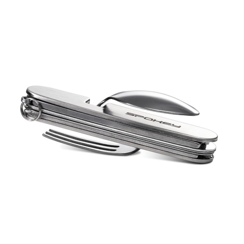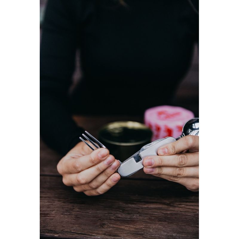 - Ein leichtes und handliches 4-in-1-Reisebesteckset bestehend aus Löffel, Gabel, Messer und Flaschenöffner.
