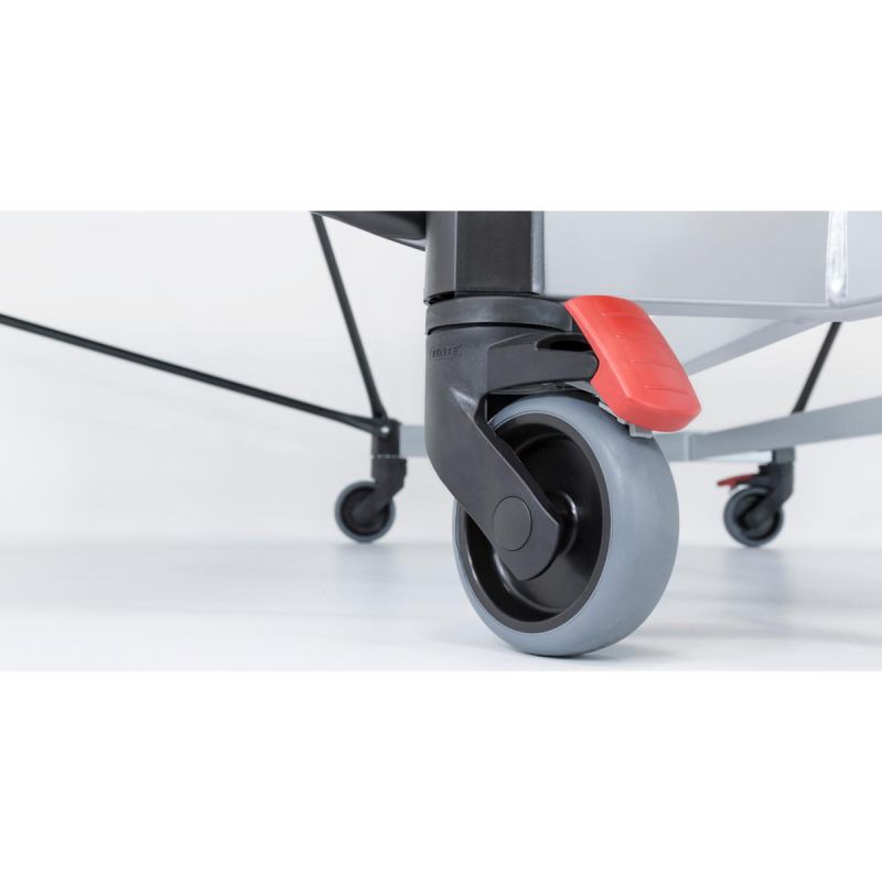 • 4 Lenkrollen mit 100 mm Durchmesser und Gummilauffläche pro Tischplatte, 2 Rollen mit Feststellmechanismus