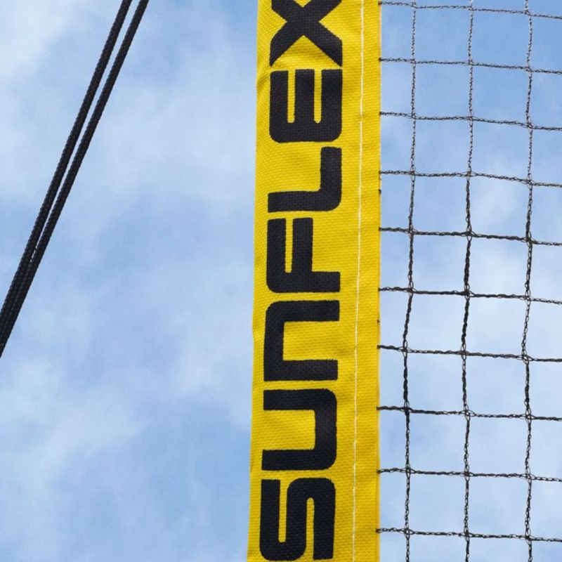Sunflex X-Net 73095 Volleyballnetz. Das Sunflex-Netz basiert auf der amerikanischen Sportart Volleyball, bei der auf einem Vier-Felder-Spielfeld gespielt wird. Das Netz ist höhenverstellbar. Es kann an verschiedene Altersgruppen sowie an Fußball oder Badminton angepasst werden. Stabilität wird durch gekreuzte Seile am Boden und mit Heringen befestigte Pfosten gewährleistet. Das Netz kann auf Gras oder Sand aufgestellt werden. Das komplette Netz wird in einer Tragetasche geliefert. Technische Daten: Spielfeldmaße: 3 x 3 m + Spannseil Netzgröße: 3 x 0,5 m Höhenverstellbar: 1 m / 1,5 m / 2 m