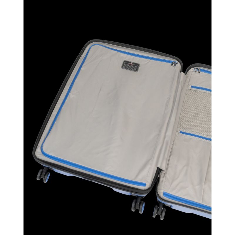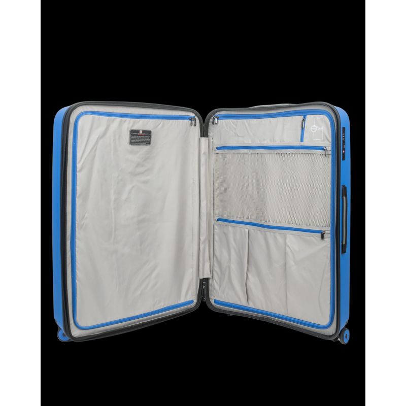 Im Inneren befinden sich zwei gut organisierte Fächer mit Reißverschlusstaschen und elastischen Gurten, die den Inhalt sicher halten. Die Fächer sind mit einem eleganten Futter ausgekleidet. Ein weiterer Vorteil des ECHO-Modells ist die Möglichkeit, den Koffer um ca. 3 cm zu erweitern.