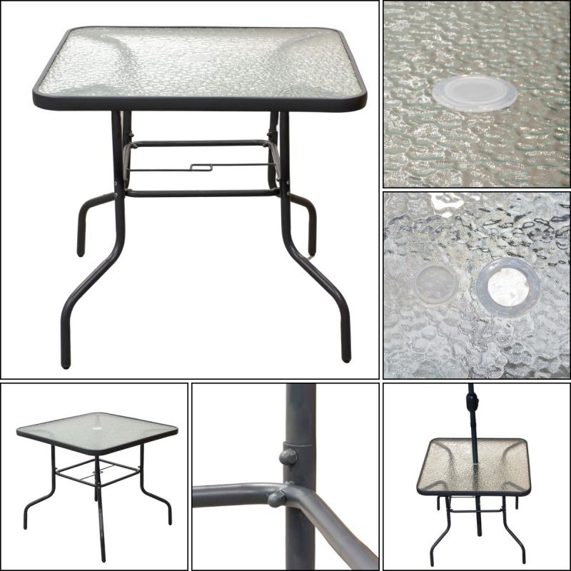 - Die aus gehärtetem Glas gefertigte Tischplatte garantiert Beständigkeit gegen Stöße und wechselnde Witterungsbedingungen.
