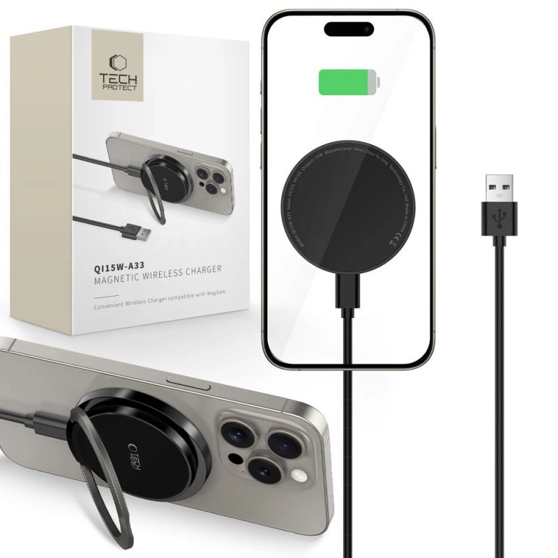 Tech-Protect QI15W-A33 induktives Ladegerät mit MagSafe und Ständer mit USB-A/USB-C-Kabel – Schwarz
