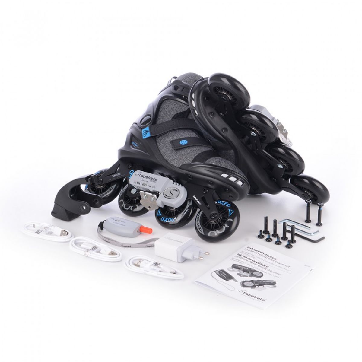- Die Rollschuhe sind mit einem revolutionären elektromechanischen Bremssystem ausgestattet, das über einen drahtlosen Controller gesteuert wird.