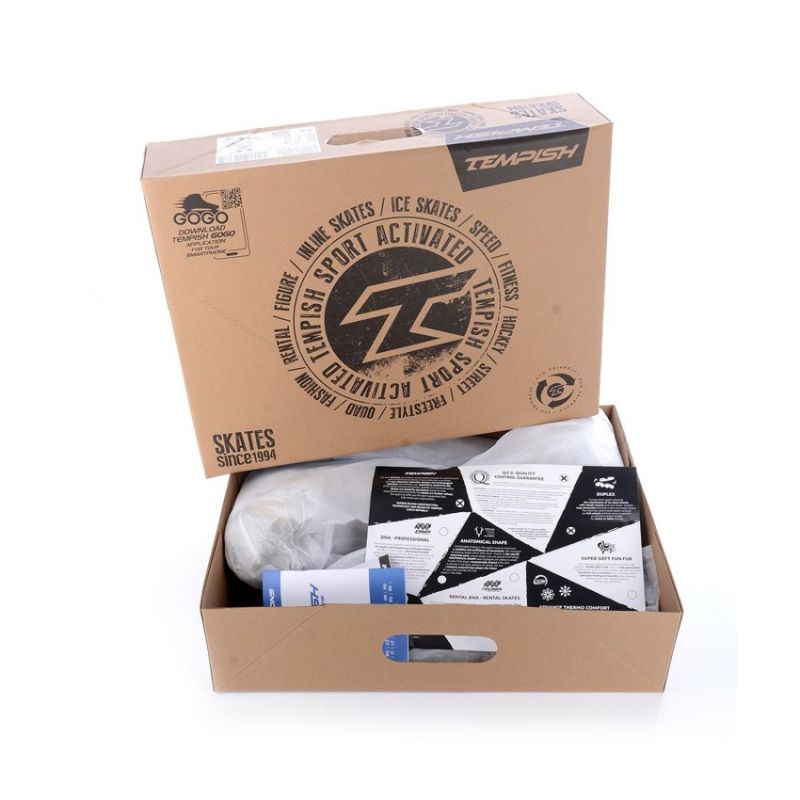 TEMPISH Enbo Duo Girl Gold verstellbare Schlittschuhe/Rollschuhe Die TEMPISH Enbo Duo Girl Gold sind verstellbare Kinder-Schlittschuhe für ganzjähriges Freizeit-Schlittschuhlaufen. Dank ihres innovativen Designs können bei diesen Schlittschuhen die Kufen gegen Rollen ausgetauscht werden, sodass sie sowohl auf Eis als auch auf Asphalt verwendet werden können und endlose Spaßmöglichkeiten bieten. Wichtige Eigenschaften: Dual-Shape-Design: Auf Vielseitigkeit ausgelegt, lassen sie sich durch Lösen von drei Schrauben einfach von Schlittschuhen in Rollschuhe umwandeln. Diese funktionale Lösung ermöglicht den ganzjährigen Gebrauch, unabhängig von der Jahreszeit. Flexibler Rahmen: Der Rahmen bleibt auch bei extremen Temperaturen bis zu -20 °C flexibel. Diese Schlittschuhe sind ideal zum Freizeit-Schlittschuhlaufen sowie zum Skaten im Freien. Ihre Niedrigtemperaturbeständigkeit garantiert Zuverlässigkeit unter allen Bedingungen. Komfort und Halt: Ein weiches, schnell trocknendes Futter sorgt auch bei langen Fahrten für Komfort. Das anatomisch geformte Futter bietet in Kombination mit dem äußeren Kunststoffrahmen festen Halt für den Knöchel. Dadurch eignen sich die TEMPISH Enbo Duo Girl Gold Schlittschuhe perfekt für Anfänger und fortgeschrittene Nachwuchs-Skaterinnen. Einfache Größenanpassung: Die Schlittschuhe verfügen über ein einfaches Größenanpassungssystem mit einem Knopf an der Seite des Rahmens, das eine einfache Anpassung innerhalb von drei Größen ermöglicht. Diese praktische Lösung ermöglicht eine längere Nutzung trotz wachsender Kinderfüße. Schneller Klettverschluss: Einer der Hauptvorteile dieses Modells ist der Verzicht auf herkömmliche Schnürsenkel, die durch einen praktischen Klettverschluss ersetzt wurden. Das ermöglicht ein schnelles und einfaches An- und Ausziehen der Schlittschuhe. Zwei zusätzliche Klettverschlüsse sind im Lieferumfang enthalten, mit denen der Knöchelriemen bei Bedarf verlängert werden kann. Weitere Funktionen: Für ein einfaches Anziehen befindet sich an der Zunge eine praktische Schlaufe. Für zusätzliche Sicherheit sind die Schlittschuhe an der Rückseite mit reflektierenden Elementen ausgestattet, die die Sichtbarkeit des Kindes bei schlechten Lichtverhältnissen erhöhen. Die TEMPISH Enbo Duo Girl Gold sind die perfekte Wahl für Mädchen, die Wert auf Komfort, Sicherheit und Vielseitigkeit legen. Dank ihres fortschrittlichen Designs und der einfachen Anpassung sorgen diese Schlittschuhe/Rollschuhe für stundenlangen Spaß auf Eis und Asphalt. TECHNISCHE DATEN Einsatzzweck: Freizeit- und Fitness-Skating, mittlere bis schwere Belastungen, für Anfänger und Fortgeschrittene Schiene: TEMPISH UNI CARBON Stahl – beschichtete Stahlkufe Rollengröße: Größen 29–32: 64 mm Rollen Größen 33–36: 70 mm Rollen Größen 37–40: 72 mm Rollen Rollenhärte: 82A Kugellager: 608, ABEC 5 Schnürsystem: Beidseitige Schnalle mit AUTO LOCK-Sicherung, 2 Klettverschlüsse Typ | Schuhschale Dreiteiliger Rahmen – Material: TPU – flexibel bis –20 °C, weiche Innensohle, PVC BRILLIANT RESIST, NYLON+NYLEX Liner (Innensocke) CAMBRA 26Z gebürstetes Nylon mit Innenfutter Bremse inklusive Obere Befestigung Schnalle 45-Grad-Befestigung Klettverschluss Achsen – Gewichtsgrenze 60 kg