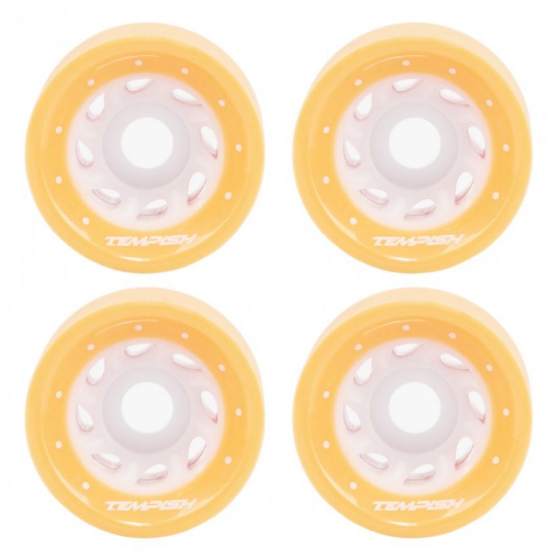 Ein Satz von vier Quad-Rollschuhrollen mit verlängerter Haltbarkeit und geringem Rollwiderstand. Diese Serie eignet sich zum Skaten auf glatten Oberflächen. Farbe: orange. Anwendung: Freizeitsport. Durchmesser: 57 mm. Härte: 90 A. Anzahl der Rollen im Satz: 4.