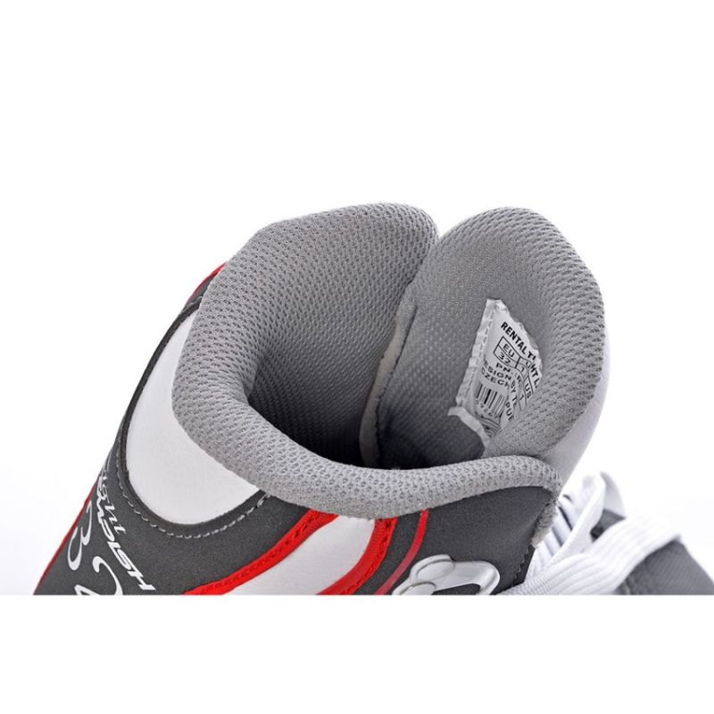 - Konstruktion: Der Schuh ist durchgehend verstärkt. Zwei Paar verstärkte Schnürsenkelhaken. Speziell verstärkte Sohlen-Schuh-Verbindung durch Schrauben, Nieten und thermische Verklebung.