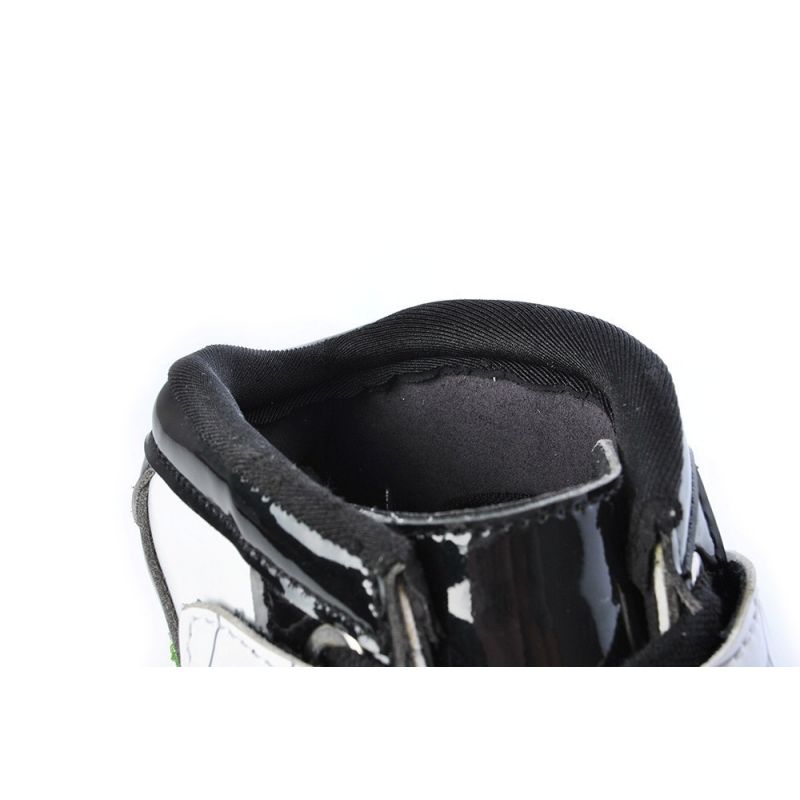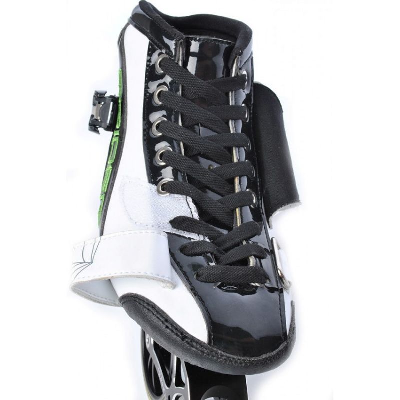 - Schuhschale: Extrem leicht, aus 7-lagigen Graphitfasern, neue anatomische Form des Skeletts im Bereich des Innen- und Außenknöchels, Schuhspitze im Bereich des Knöchels und der Achillesferse – Comfort Fix, verstärkt mit zwei Riemen, einer davon mit Mikroschnalle