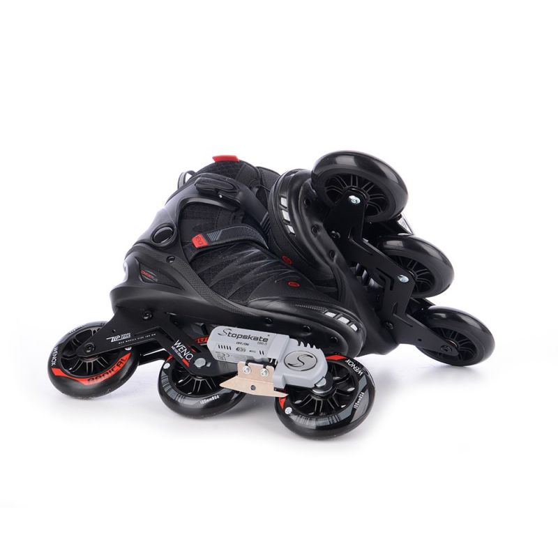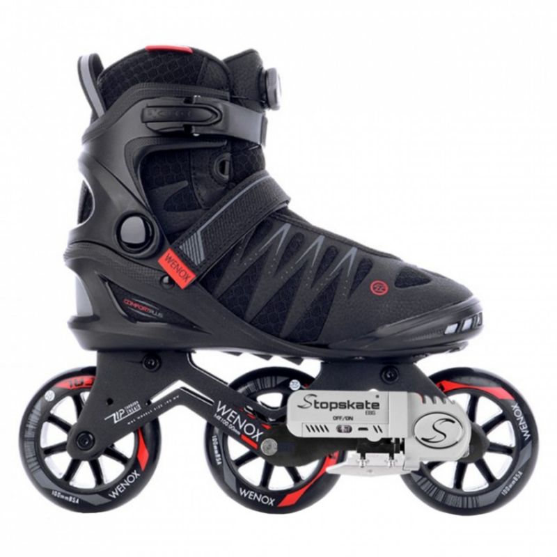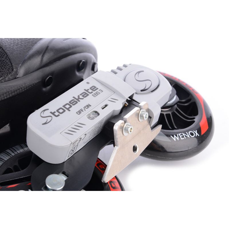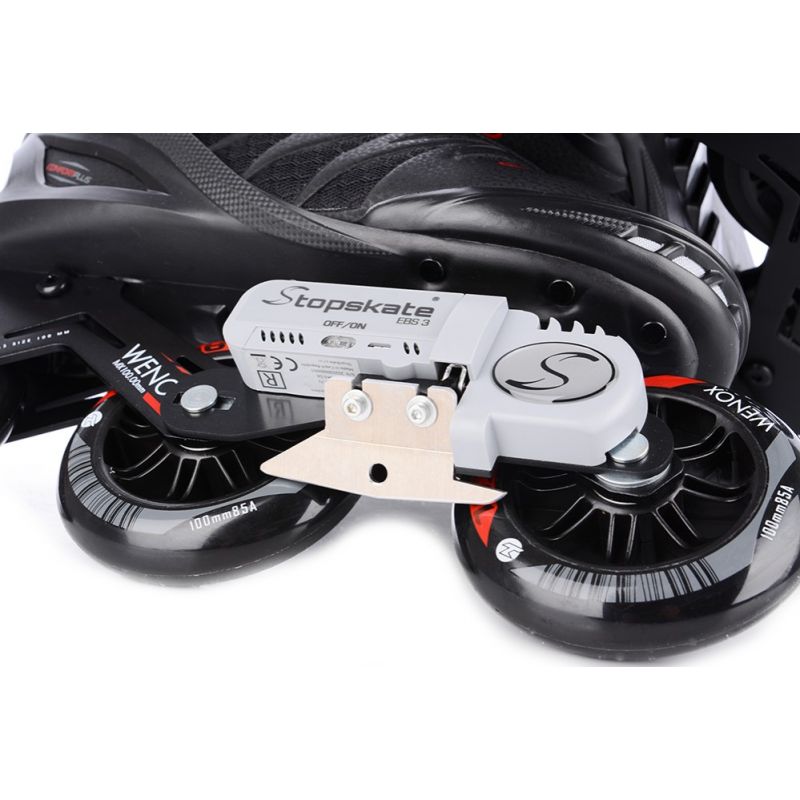 Die TEMPISH Wenox Top EBS Inline-Skates verfügen über ein revolutionäres elektromechanisches Bremssystem, das über einen kabellosen Controller gesteuert wird. Das Bremsen dieser Skates ist jetzt komfortabler, sicherer, einfacher und effizienter als mit einer herkömmlichen Hinterradbremse! Dieses Modell ist für Benutzer bis 90 kg ausgelegt. Weitere Informationen zu diesem patentierten tschechischen Produkt finden Sie unter: www.stopskate.com. Dieses Produkt ist nicht auf Lager und innerhalb von 10 Tagen nach Eingang Ihrer Bestellung verfügbar. Diese attraktiven Inline-Skates sind für aktive Fitness-Skater konzipiert. Sie vereinen die neuesten Technologien und Trends im Fitness-Skaten. Diese Skates sind für fortgeschrittene und erfahrene Skater konzipiert. Die robusten dreirädrigen Rahmen mit Rollen bis zu 100 mm ermöglichen wirklich schnelles und komfortables Skaten, auch über lange Strecken. Die Rahmen sind relativ kurz und gewährleisten gute Mobilität und einfachere Manövrierfähigkeit in Bereichen, in denen Sie häufig die Richtung ändern müssen. Die bequeme Innensohle hat zwei Schichten. Die härtere Außenschicht hält den Fuß fest in der Schale, während die weichere Innenschicht den Fuß eng umschließt und so ein Gefühl von hohem Komfort und sicherer Skate-Kontrolle vermittelt. Für zusätzliche Sicherheit sind die Skates mit reflektierenden Elementen ausgestattet, die ihre Sichtbarkeit bei schlechten Sichtverhältnissen deutlich erhöhen. Die feste Schale wird über die Sohle belüftet und die Luft wird über die Innensohle unter dem gesamten Fuß verteilt. Das moderne TEMPISH-Schnürsystem ermöglicht schnelles An- und Ausziehen. Durch Festziehen des Riemens am Spann und der oberen Schnalle am Kragen kann jeder Benutzer die optimale Fußposition in der Schale für eine perfekte und bequeme Skate-Kontrolle einstellen. TECHNISCHE SPEZIFIKATIONEN: Verwendungszweck: Fitness, Anfänger, Fortgeschrittene und erfahrene Skater. Schiene: Aus Aluminiumlegierung, festes Schiene-Befestigungssystem. Radgröße: 100 mm Radhärte: 85A Lager: 608, ABEC 9 Schnürsystem: FitGo-Typ | PE/NYLON-Schuhschale, zweiteiliger anatomischer Knöchelbereich, verstärkte, erhöhte Konstruktion. Innensohle: Verstärktes NYLON/NYLEX, anatomisch geformt, Memory-Material, außen verstärkt, weiche Polsterung im Achillessehnenbereich, anatomische Innensohle. EBS-Bremse. Verschluss: Schnalle. 45-Grad-Klettverschluss. 6/28-mm-Achsen. Gewichtslimit: 90 kg.