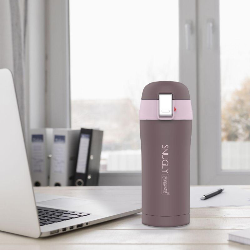 Ein praktischer Knopf ermöglicht das schnelle Öffnen und Schließen des Bechers. Er ist die ideale Lösung für Autofahrer, Studenten oder alle, die viel unterwegs sind.