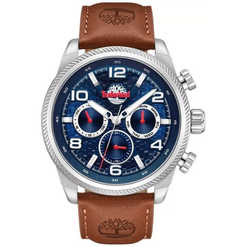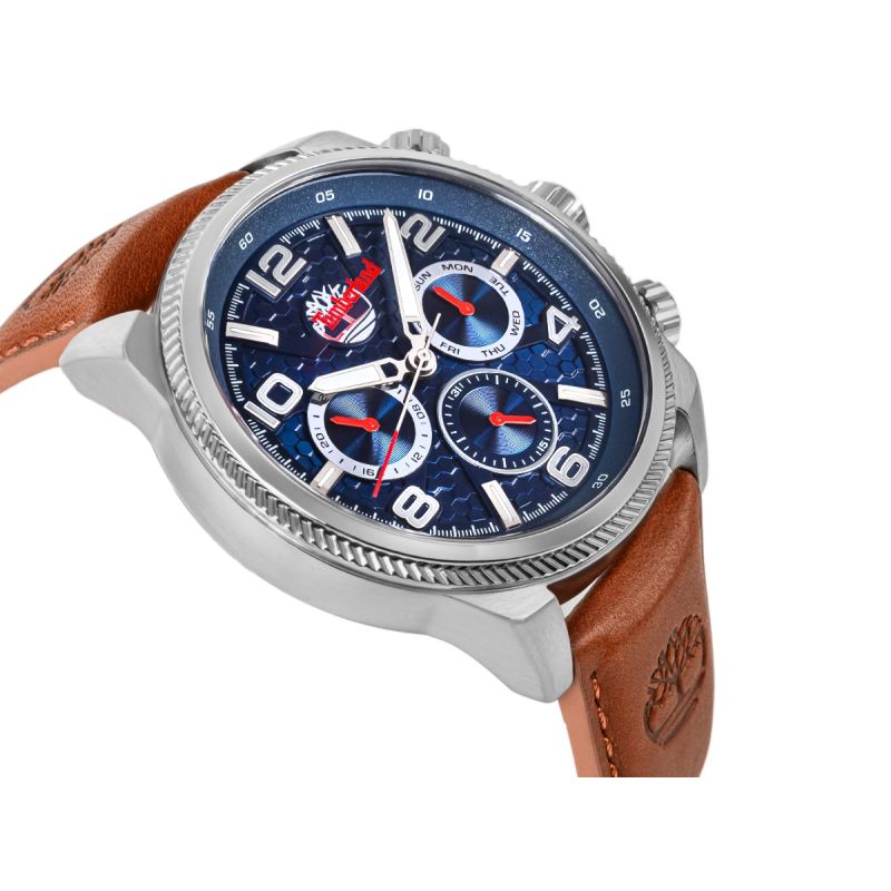 Die Uhr ist mit einem warmbraunen Lederarmband ausgestattet, das perfekt zum Zifferblatt passt. Die natürliche Lederstruktur und das geprägte Timberland-Logo unterstreichen Authentizität und Outdoor-Stil und sorgen gleichzeitig für hohen Tragekomfort.