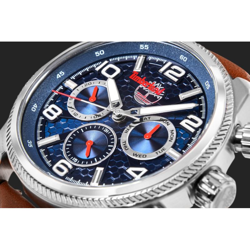 Das zentrale Element ist das tiefblaue Zifferblatt mit seiner markanten Wabenstruktur. Seine dreidimensionale Textur spielt wunderschön mit dem Licht und verleiht der Uhr Dynamik und Tiefe. Das dezent in das Glas eingelassene Timberland-Logo erzeugt einen interessanten Schichteffekt und unterstreicht den modernen Charakter des Modells.