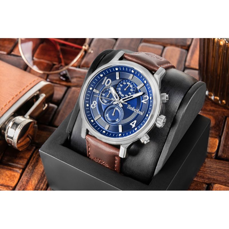 Das Design wird durch ein dunkelbraunes Lederarmband aus echtem Leder mit leicht rauer Oberfläche abgerundet. Dessen Textur und das geprägte Timberland-Logo unterstreichen die Authentizität und die Outdoor-Tradition des Modells und gewährleisten gleichzeitig hohen Tragekomfort.