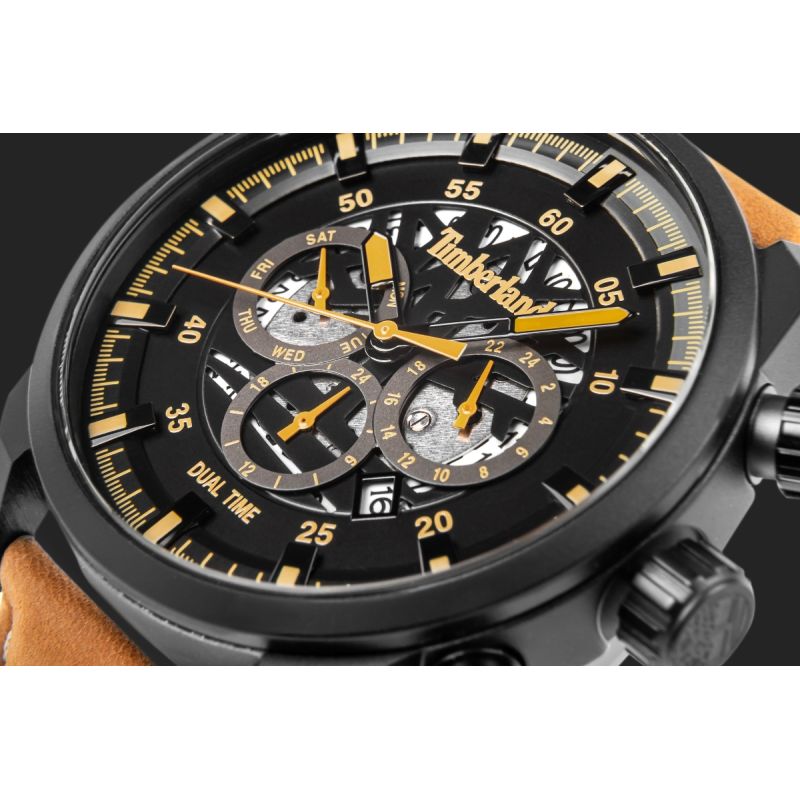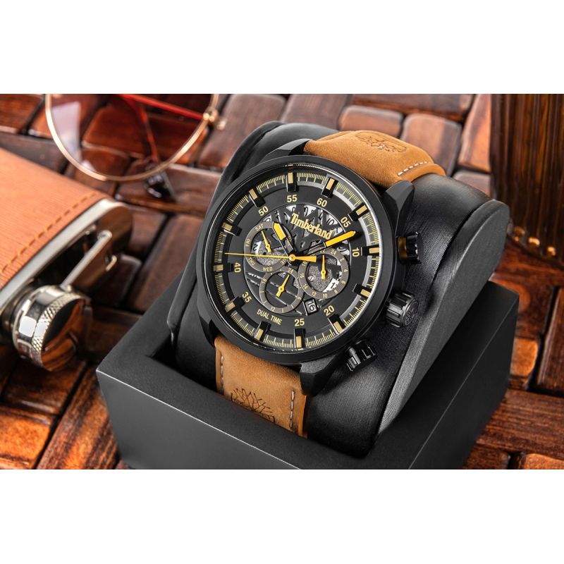 Das gesamte Design wird durch ein robustes, dunkles Gehäuse mit modernem Finish unterstrichen, das den unverwechselbaren Stil der Uhr hervorhebt. Ein Nubuklederarmband in einem markanten Sandton mit geprägtem Timberland-Logo rundet das Design ab. Seine weiche, natürliche Textur sorgt für hohen Tragekomfort und passt perfekt zum Outdoor-Look.