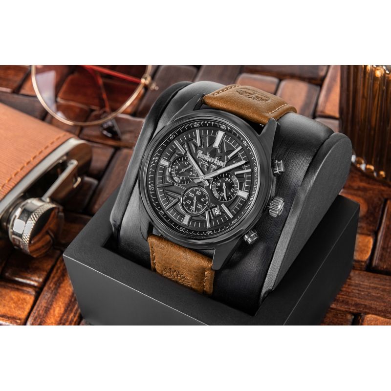 Die zahlreichen Hilfszifferblätter unterstreichen den technischen Charakter der Uhr und sind gleichzeitig gut ablesbar und intuitiv bedienbar. Das gesamte Modell ist mit einem robusten, naturbraunen Lederarmband ausgestattet, das mit dem Timberland-Logo geprägt ist und so die Authentizität der Marke und ihre Outdoor-DNA hervorhebt.