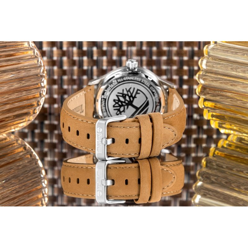 Das Modell ist mit einem Nubuklederarmband in einem natürlichen, warmen Farbton ausgestattet. Die weiche, matte Nubuklederstruktur und die dezente Prägung des Timberland-Logos unterstreichen den Outdoor-Charakter der Uhr und sorgen für hohen Tragekomfort.