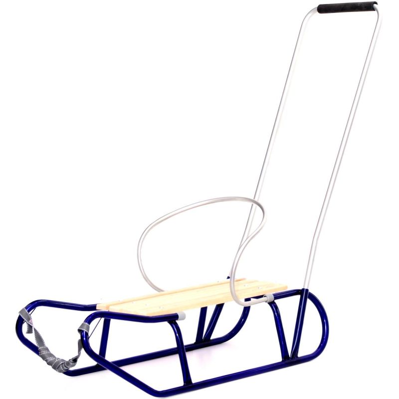 Der TOMEK Metallschlitten mit Rückenlehne und Schieber, blau, bietet Fahrspaß im Schnee und Komfort beim Gehen!
