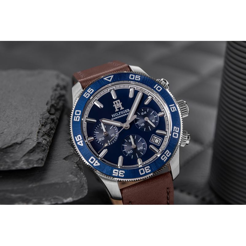 Der Tommy Hilfiger TH85 Chronograph 1792163 vereint Eleganz und Funktionalität und ist damit die perfekte Uhr für den modernen Mann. Das marineblaue Zifferblatt mit dezenten Golddetails verleiht ihr einen klassischen und zugleich dynamischen Charakter. Ausgestattet mit Datumsanzeige und Chronographenfunktion, vereint die Uhr Ästhetik und Praktikabilität und erfüllt so die Bedürfnisse des Alltags. Das silberfarbene Edelstahlgehäuse mit marineblauer Lünette bildet ein harmonisches Gesamtbild, während das Mineralglas das Zifferblatt vor Kratzern schützt. Ein braunes Lederarmband sorgt nicht nur für hohen Tragekomfort, sondern verleiht der Uhr auch eine elegante Note. Der verschraubte Gehäuseboden bietet zusätzlichen Schutz, und die Wasserdichtigkeit bis 50 Meter macht das Modell spritzwassergeschützt. Diese Uhr ist die ideale Wahl für Männer, die klassischen Stil mit modernen Funktionen verbinden möchten.